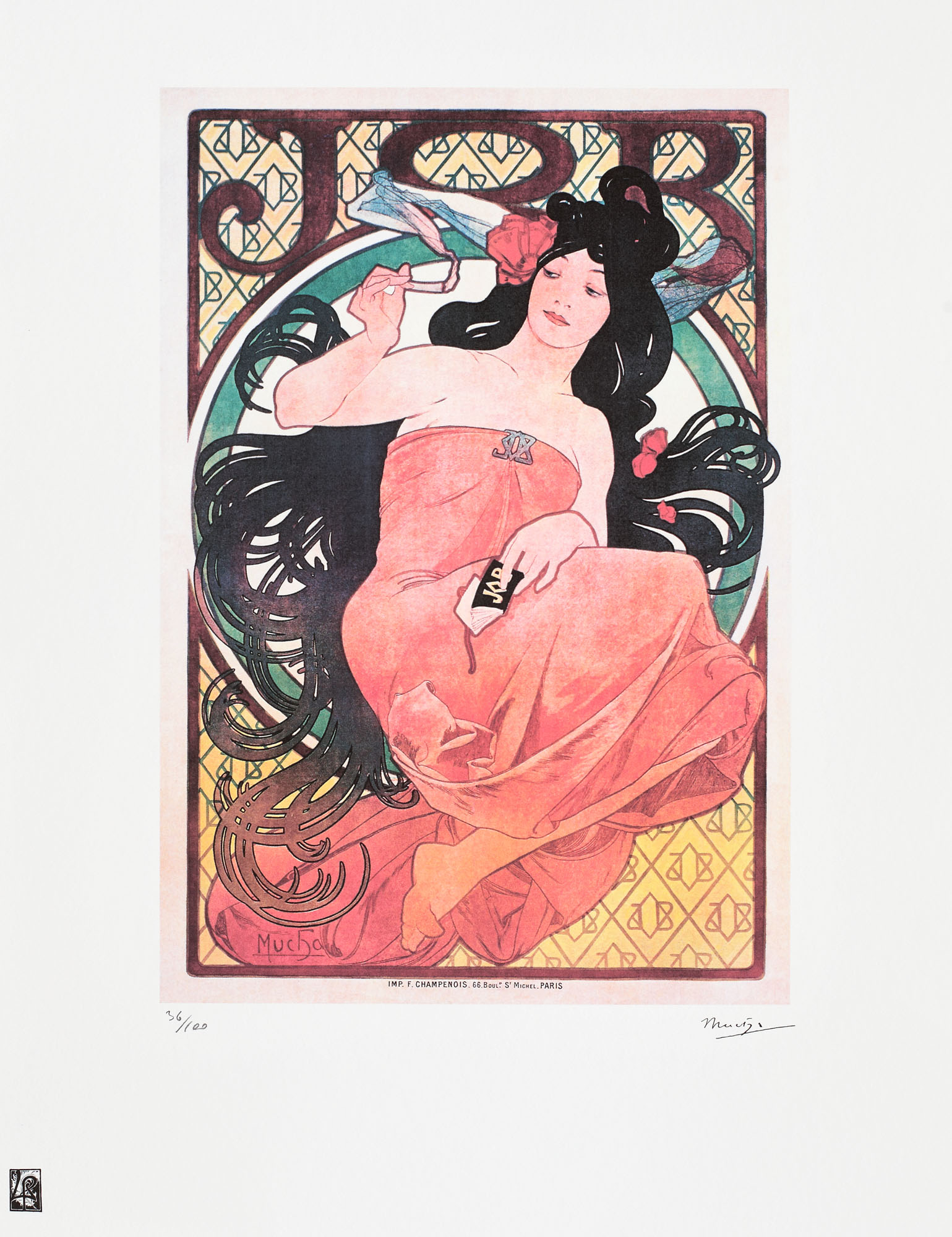 semnat dreapta jos, sub cadru, ”Mucha”; numerotat stânga jos, sub cadru, în creion, ”36/100”