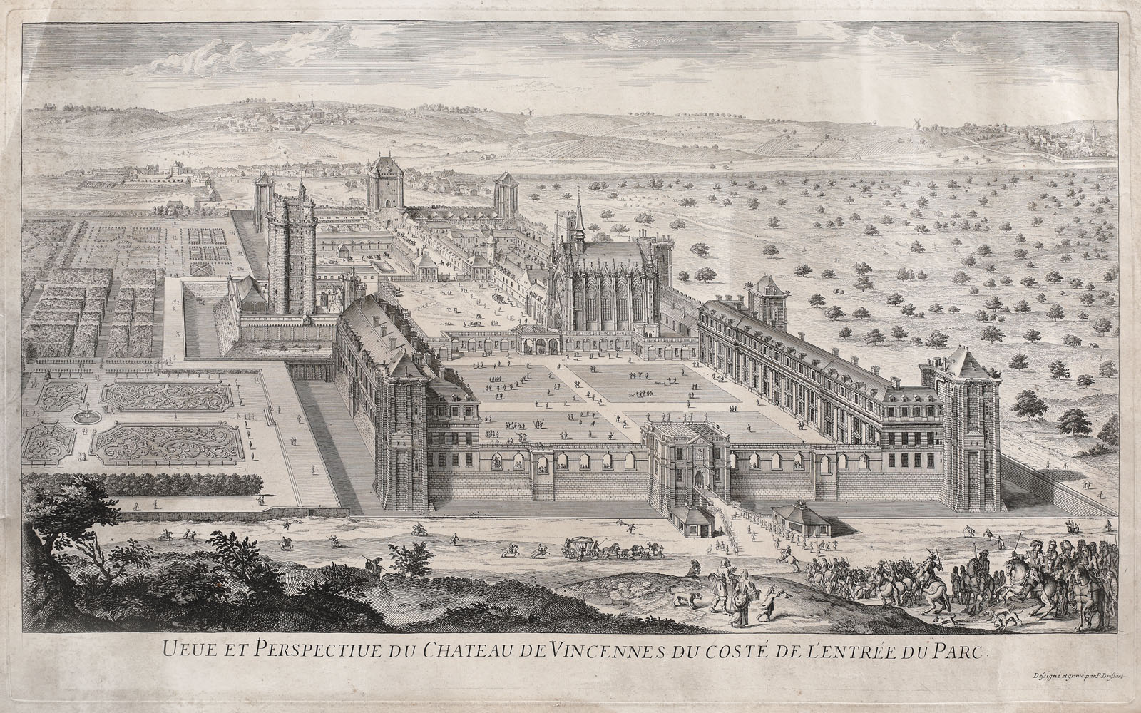 inscripționat, gravat, sub cadru, "VEUE ET PERSPECTIVE DU CHATEAU DE VINCENNES DU COSTE DE L’ENTREE DU PARC, semnat și notat, gravat, dreapta jos, sub cadru, "Designé et graué par P. Brissart"