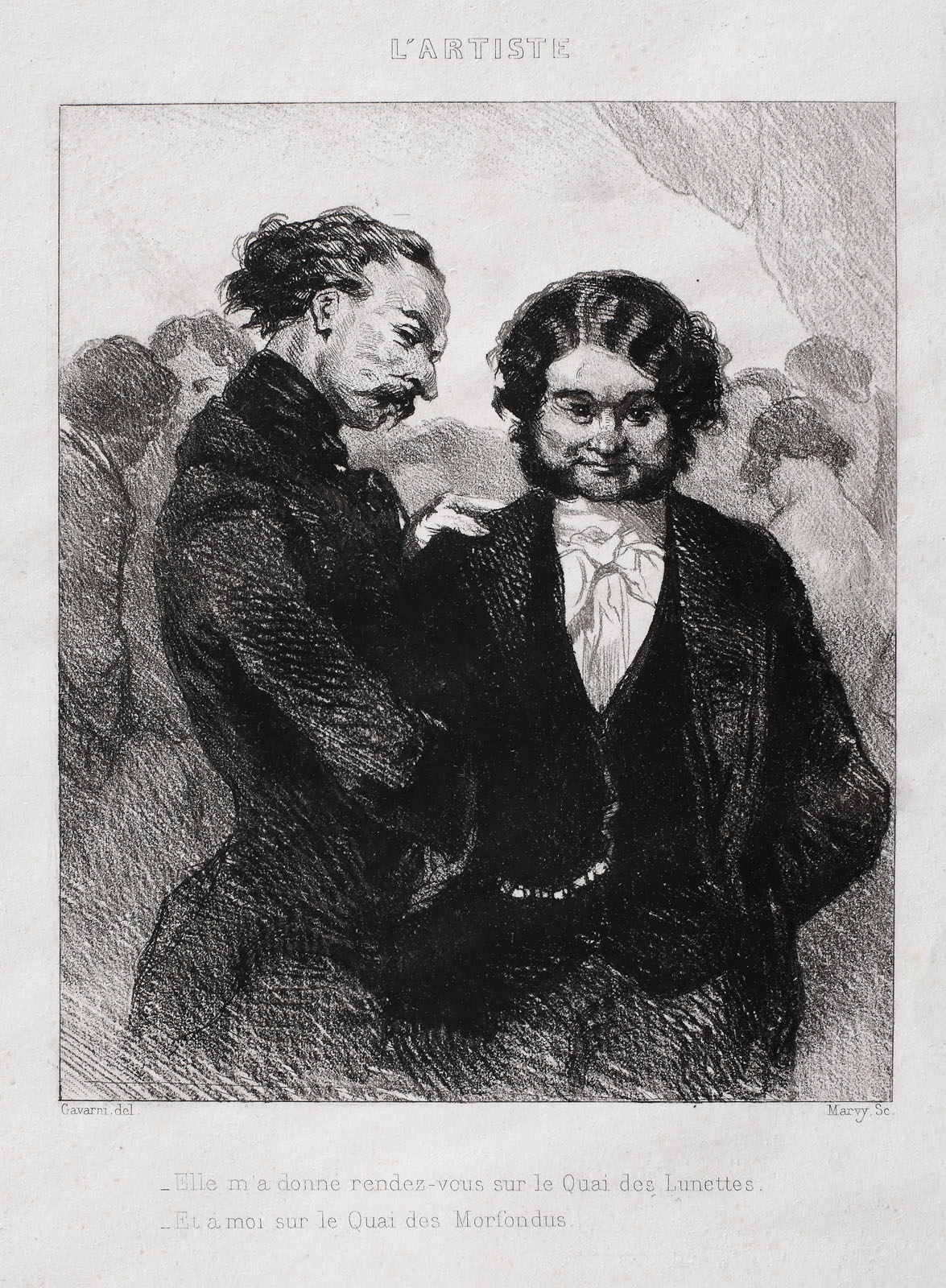 semnat stânga jos, sub cadru, "Gavarni del."; semnat dreapta jos, sub cadru, "Marvy Sc." notat central sus, "L'ARTISTE"; notat central jos, gravat, "Elle m'a donne rendez-vous sur le Quai des lunettes/ Et a moi sur le Quoi des Morfondus"