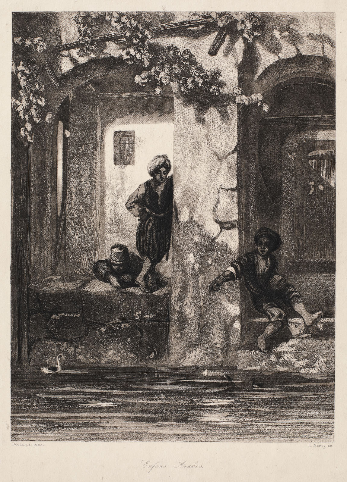 semnat stânga jos, sub cadru, "Decamps pinx."; semnat dreapta jos, sub cadru, "L. Marvy sc."; intitulat central jos, sub cadru, "Enfans Arabes"