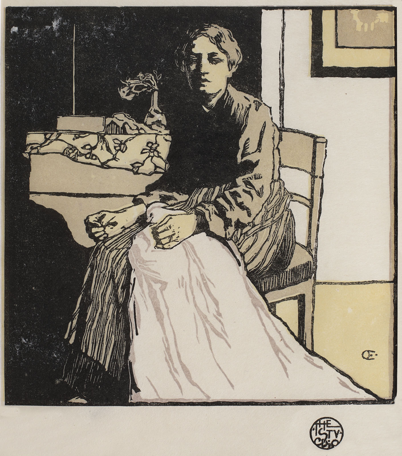 semnat lateral dreapta, gravat, în monogramă, "OE"; dreapta jos, ștampilă de atelier, "The studio"