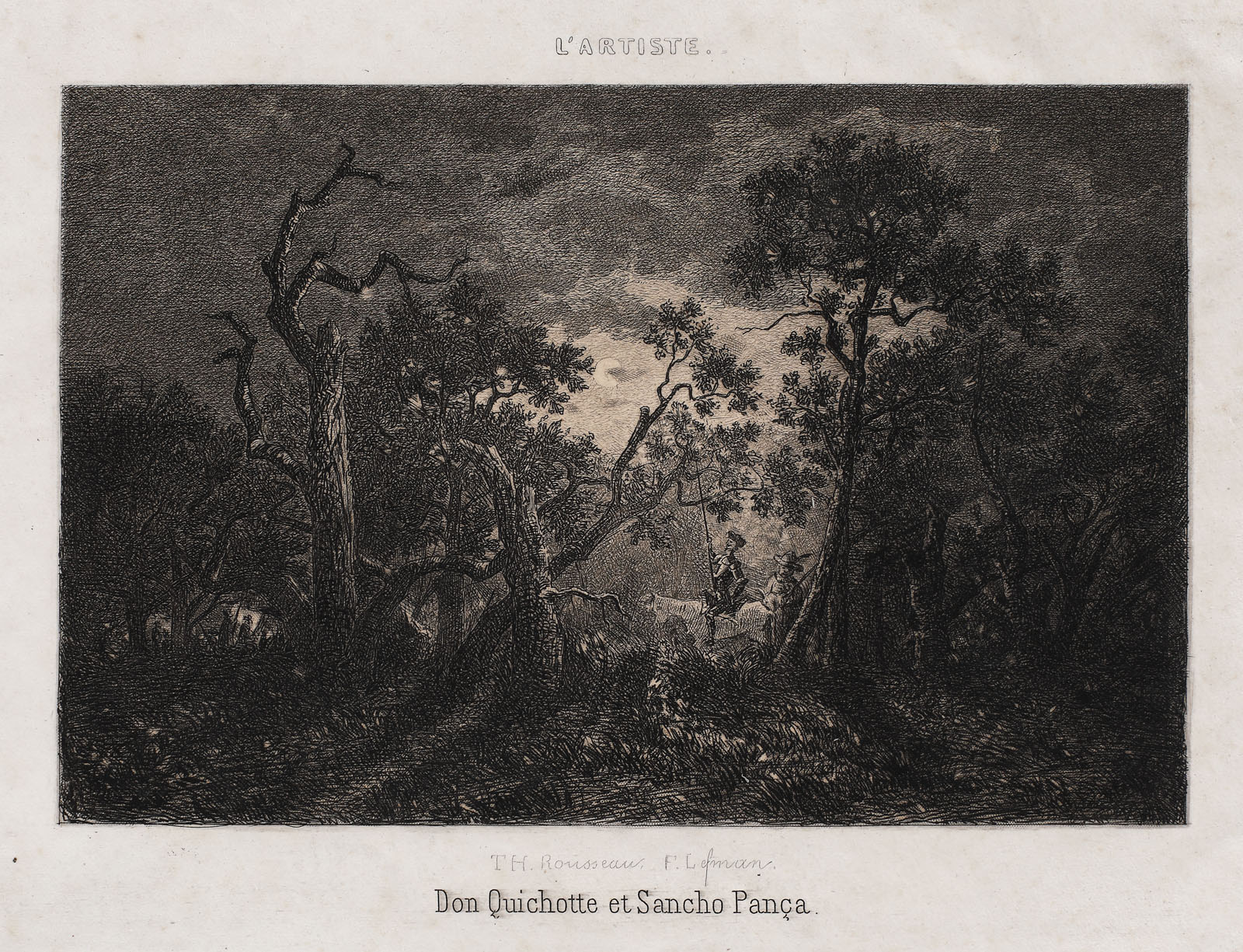 semnat central jos, sub cadru "TH. Rousseau, F. Lefman"; intitulat central jos, sub cadru, "Don Quijote et Sancho Panca"; notat central sus, "L' ARTISTE" (tiraj 1831)