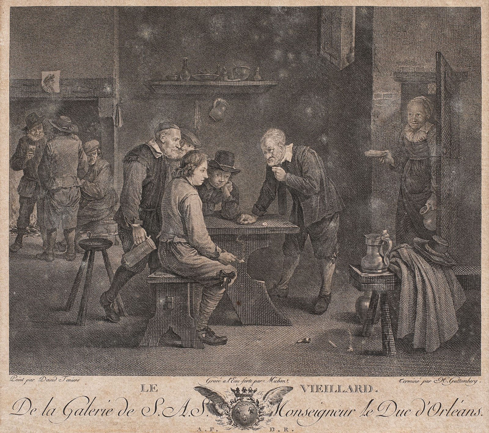 semnat stânga jos, sub cadru, "David Teniers"; notat central jos, sub cadru, "Gravé a l'eau forte par Michon"; notat dreapta jos, sub cadru, "Terminé par H. Guttenberg"