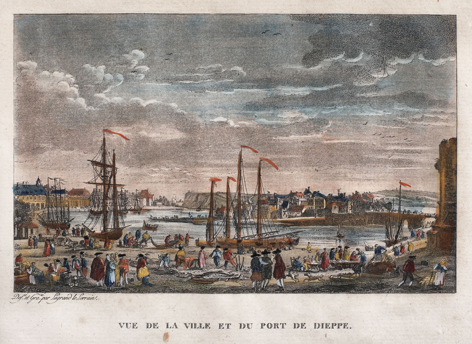 semnat dreapta jos, sub cadru, "Des. et grave par Legrand le Lorrain"; notat central jos, gravat, "Vue de la ville et du port de Dieppe"