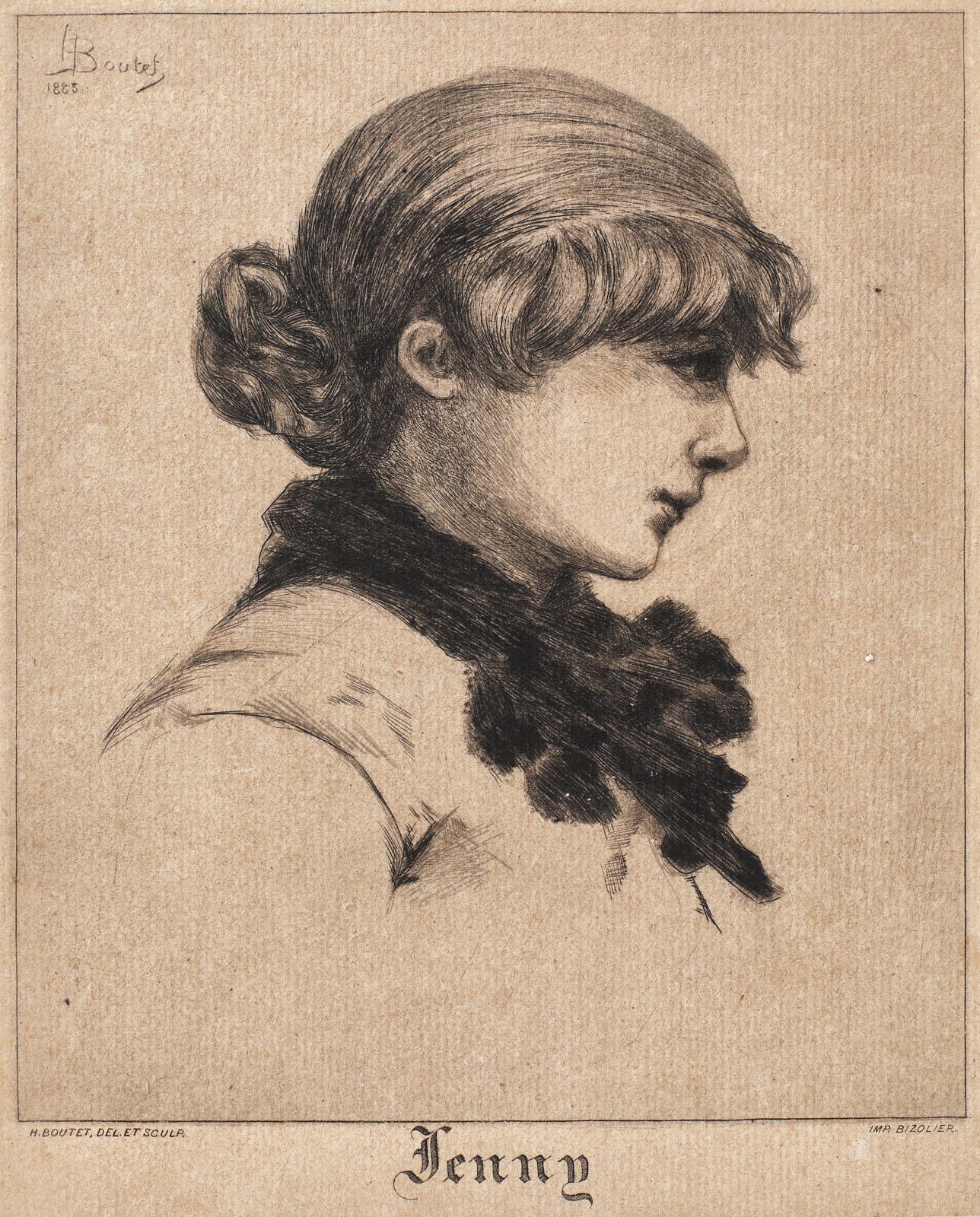 semnat şi datat dreapta sus, gravat, "H. Boutet, 1885"; semnat stânga jos, gravat. "H. Boutet, del. et. sculp.; menţionat dreapta jos, "Imp. Bizolier"