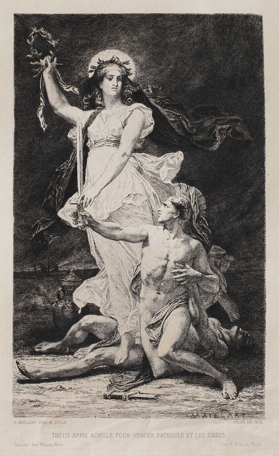 semnat dreapta jos, gravat, "MAILLART"; semnat stânga jos, sub cadru, "D. Maillart pinx. et sculp."; notat dreapta jos, sub cadru, "Salon de 1875"; intitulat și notat central jos, sub cadru, "Thetis arme Achille pour venger Patrocle et les grecs, Gazette des Beaux-Arts, Imp. A. Salmon, Paris"