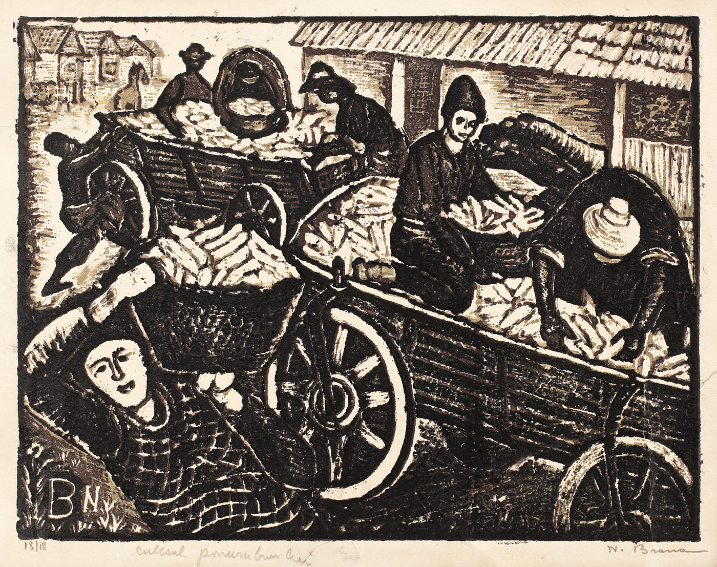 semnat stânga jos, în placă, "BN"; semnat dreapta jos, în creion, "N.Brana", numerotat şi intitulat stânga jos, în сreion, "18/18, Culesul porumbului"