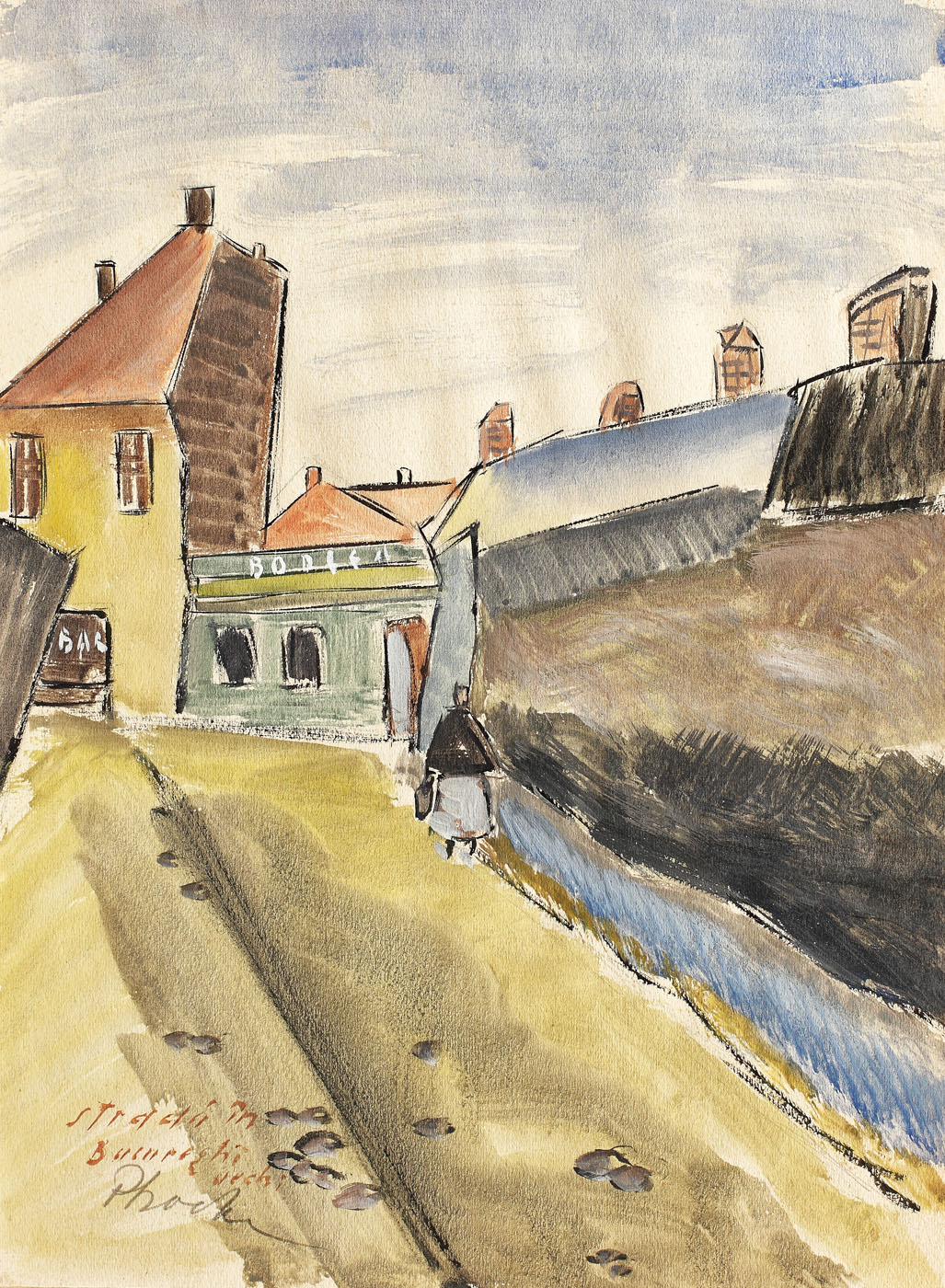 semnat stânga jos, în creion, "Phoebus"; intitulat stânga jos, cu brun, "Stradă în Bucureştii vechi"