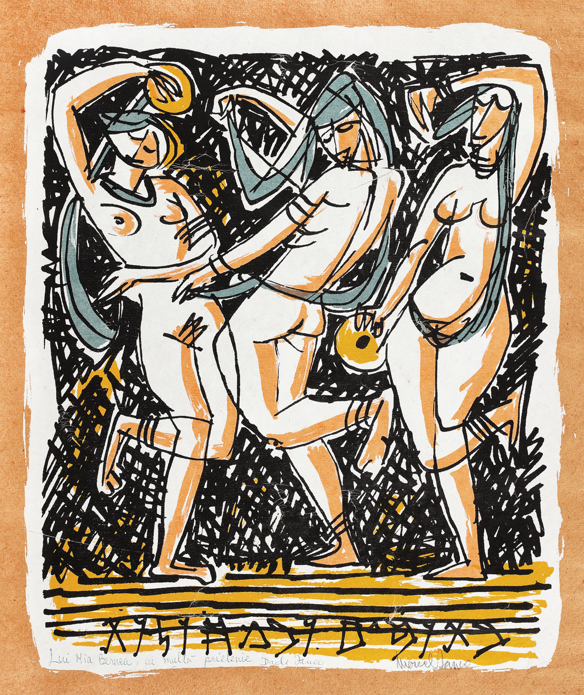 semnat dreapta jos, în creion, "Marcel Ianco"; dedicat stânga jos, în pix, "Lui Mia Bernea, cu multă prietenie, Dadi Janco"