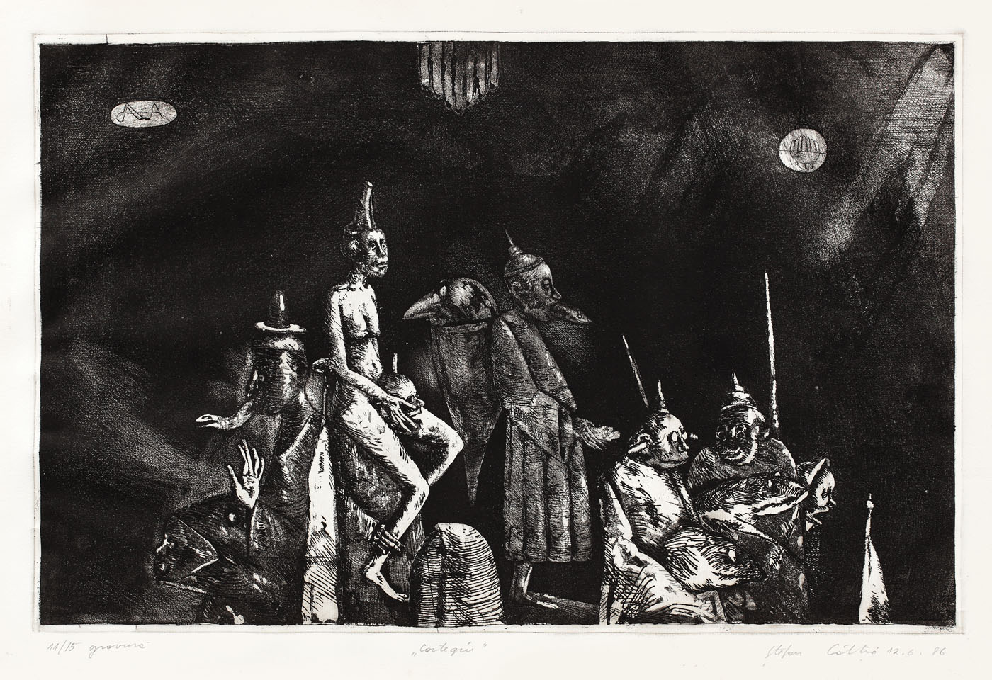 semnat şi datat dreapta jos, în creion, "Ştefan Câlţia, 12.6.1986"; numerotat stânga jos, în creion, "11/15, gravură"; intitulat central jos, în creion, "Cortegiu"