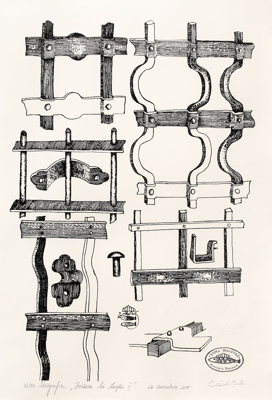 semnat, datat, intitulat şi numerotat central jos, în creion, "38/50, Fierăria lui Lazăr VI, 26 noimebrie 2015, Câlţia"
