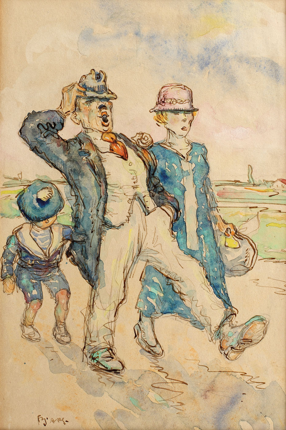 acuarelă și peniță pe hârtie lipită pe carton