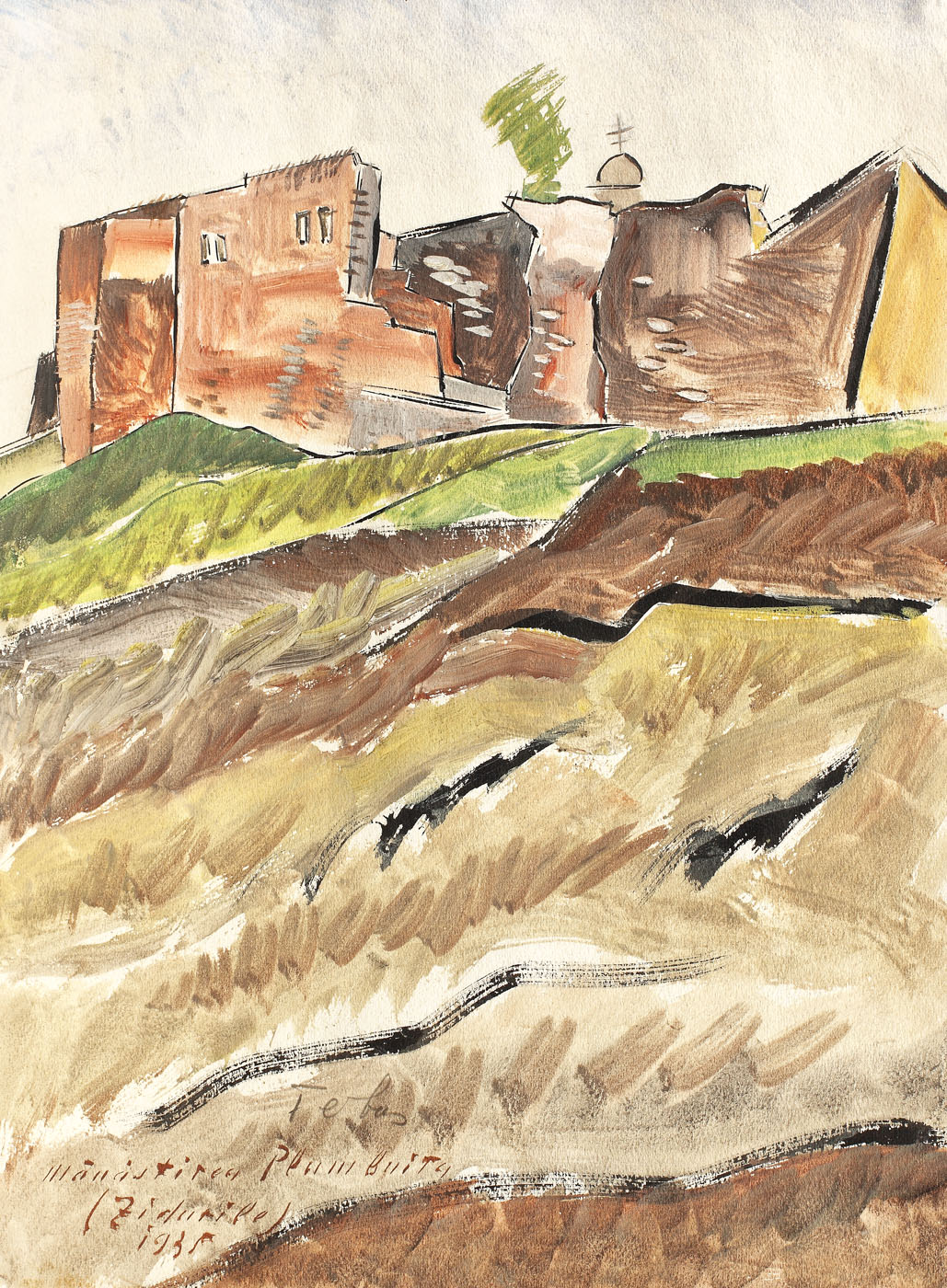 semnat stânga jos, în creion, "P(ho)ebus; localizat, intitulat şi datat stânga jos, cu brun, "Mănăstirea Plumbuita, (Zidurile), 1935"