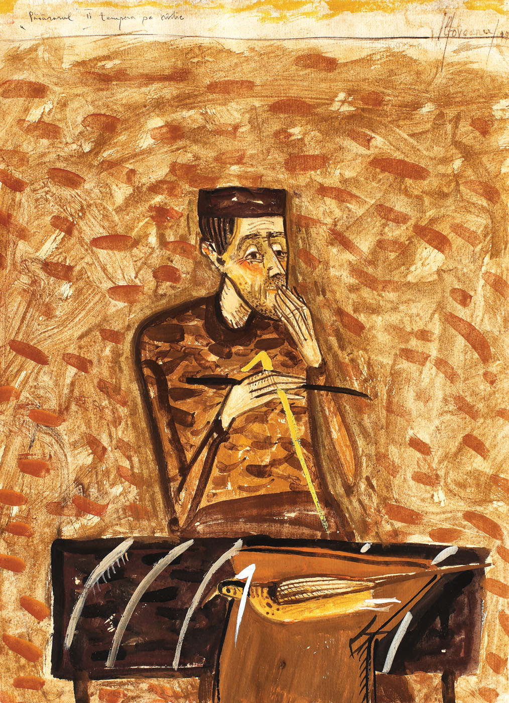 semnat şi datat dreapta sus, cu negru, "Ilfoveanu, 1991", intitulat stânga sus, cu negru, "Păsărarul II"