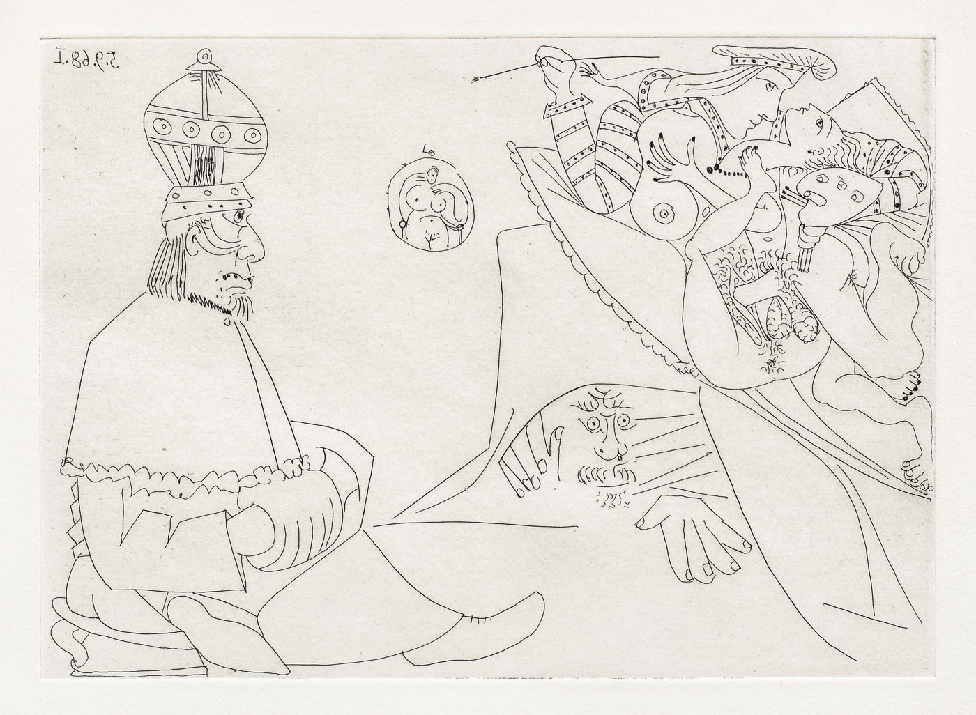 Gravura de față face parte din ciclul dedicat de Picasso celebrului pictor și arhitect renascentist Rafael. Creată între august și septembrie 1968, pe când Picasso avea 86 de ani, seria prezintă într-o manieră explicită aventurile sexuale ale lui Rafael împreună cu celebrul model Margherita Luti (La Fornarina). Aceasta este una dintre cele 25 de instanțe create de Picasso acestui subiect.