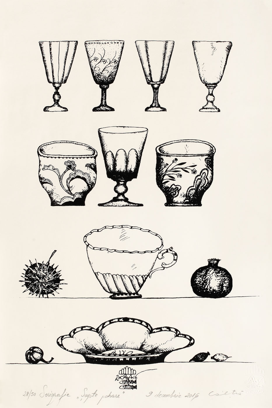semnat, datat, intitulat şi numerotat central jos, în creion, "28/50, Şapte pahare, 9 decembrie 2016, Câlţia"