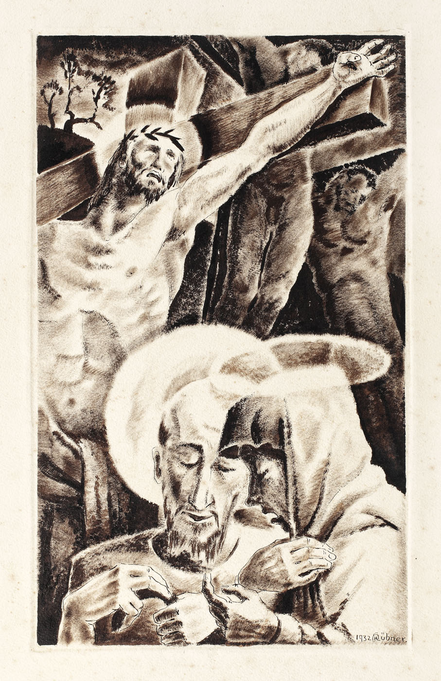 Opera a participat la Salonul Oficial. Desen și Gravură, noiembrie-decembrie 1932 și este menționată și reprodusă în catalogul expoziției la cat. 109. Opera este reprodusă în "Plastica 1932. L'art roumain en 1932", Henri Blazian la pag. 92, sub titlul "Răstignire". Opera este reprodusă în catalogul expoziției retrospective "Karl Hübner", Muzeul de Artă Brașov, 2012 la pag. 22.