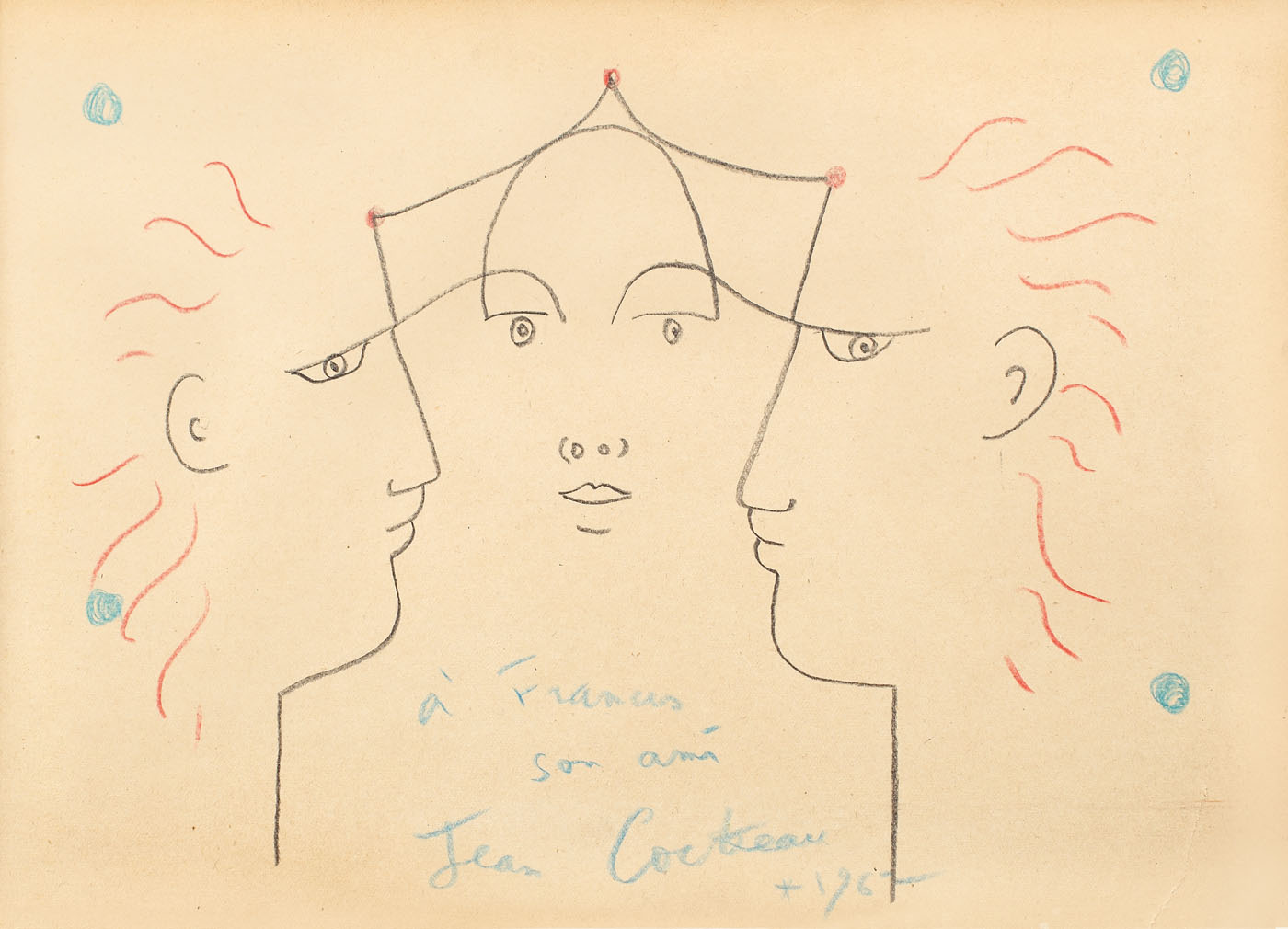 semnat, datat și dedicat central jos, cu albastru, "À Frances, son ami Jean Cocteau, 1962"