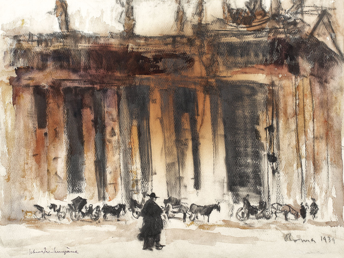 semnat stânga jos, cu albastru, "Schweitzer-Cumpăna"; localizat și datat dreapta jos, cu negru, "Roma, 1939"