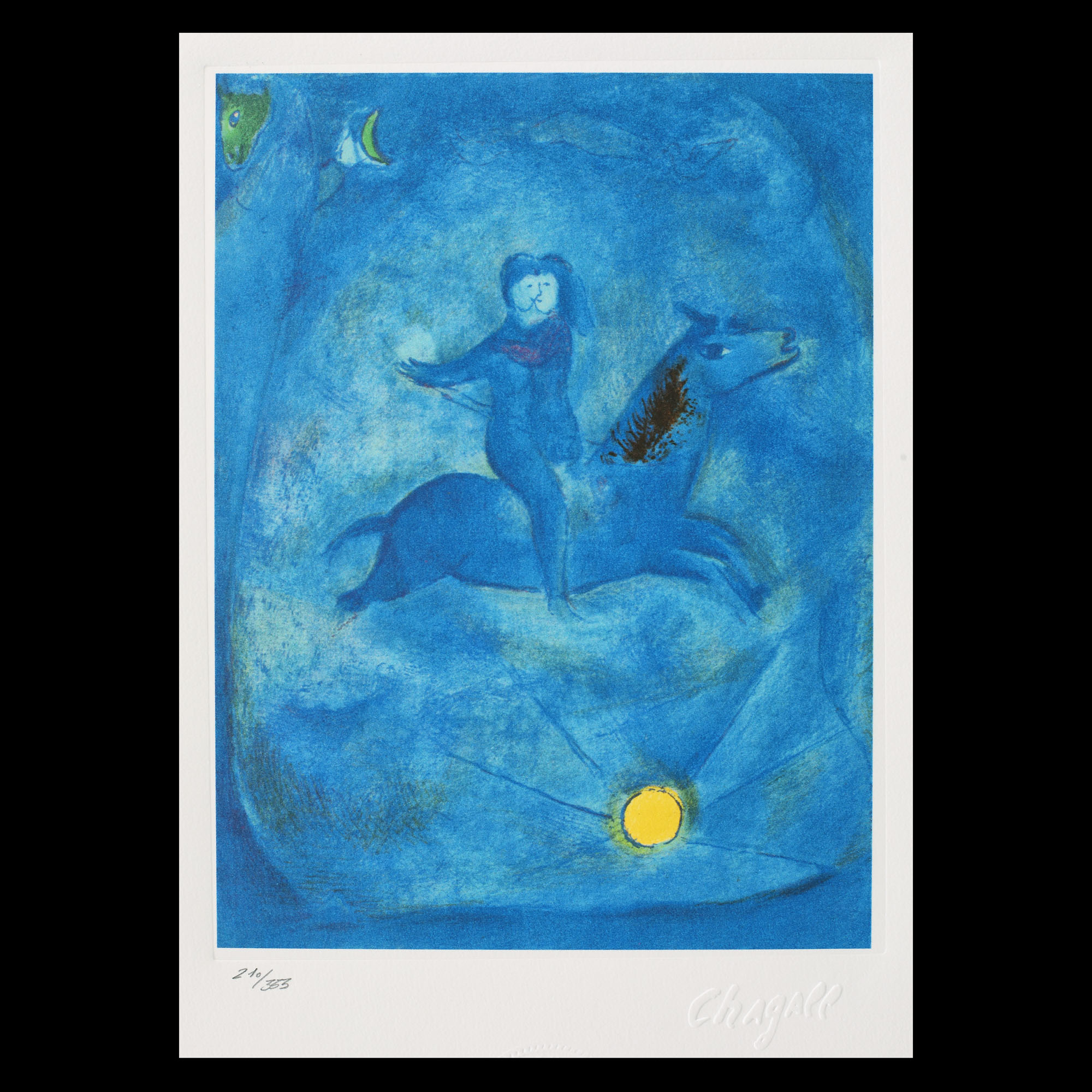semnat dreapta jos, sub cadru, ”Chagall”; numerotat stânga jos, sub cadru, în creion, ”210/363”; central jos, ştampila editurii, "SPADEM, Marc Chagall, Edition of 333"