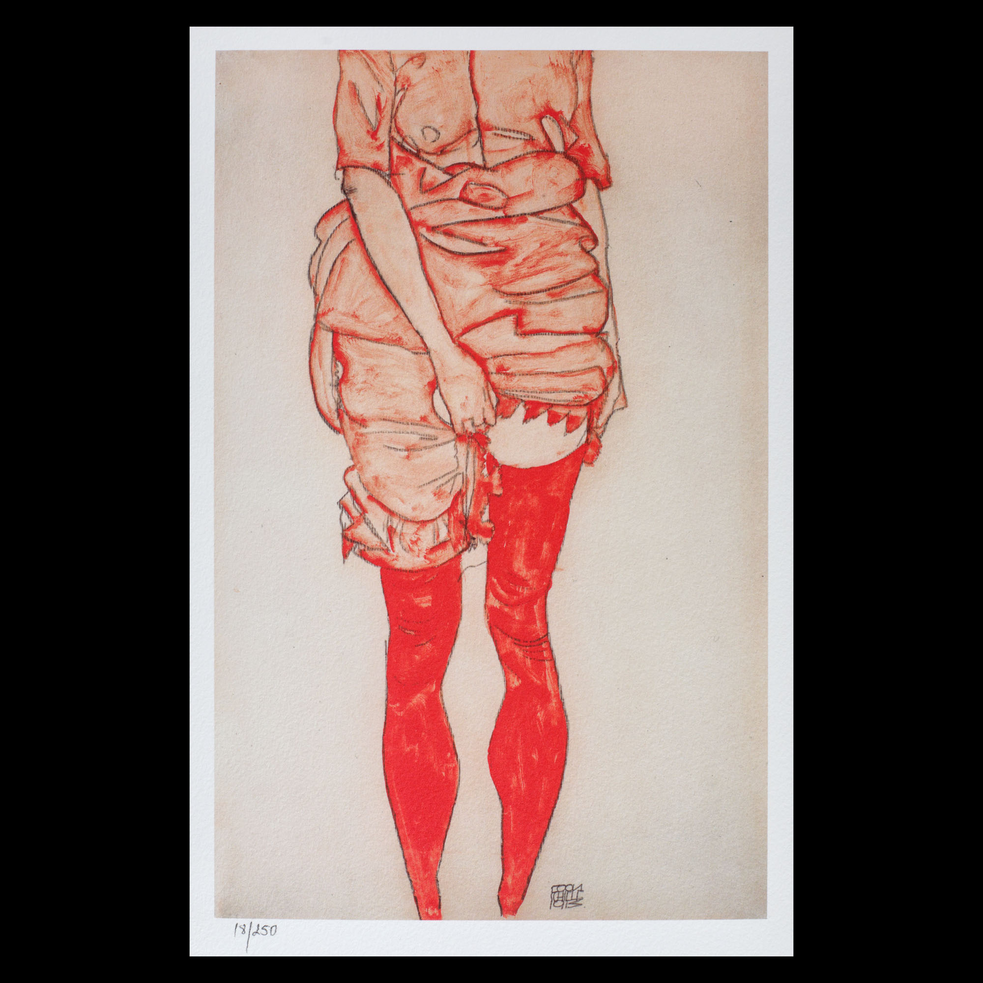 semnat și datat dreapta jos, în placă, ”EGON SCHIELE, 1913”; numerotat stânga jos, sub cadru, ”18/250”; stânga jos, ștampila editurii, ”D&P CERTIFIED ARTS USA EUROPE SINCE 1997”