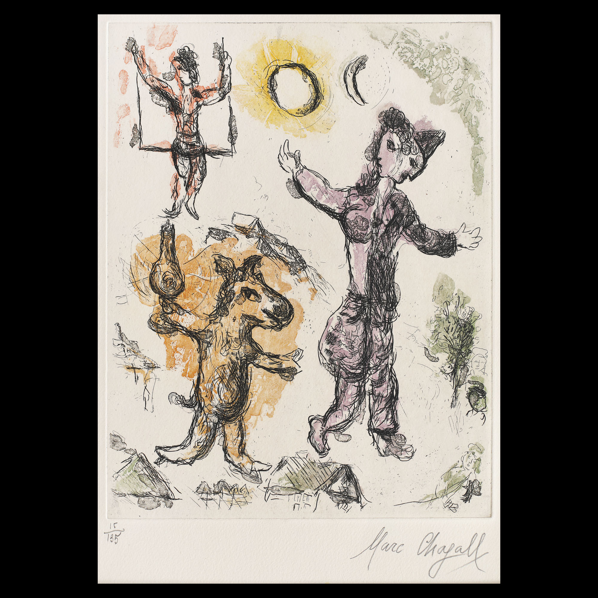 semnat dreapta jos, sub cadru, în creion, ”Marc Chagall”; numerotat stânga jos, sub cadru, în creion, ”15/135”