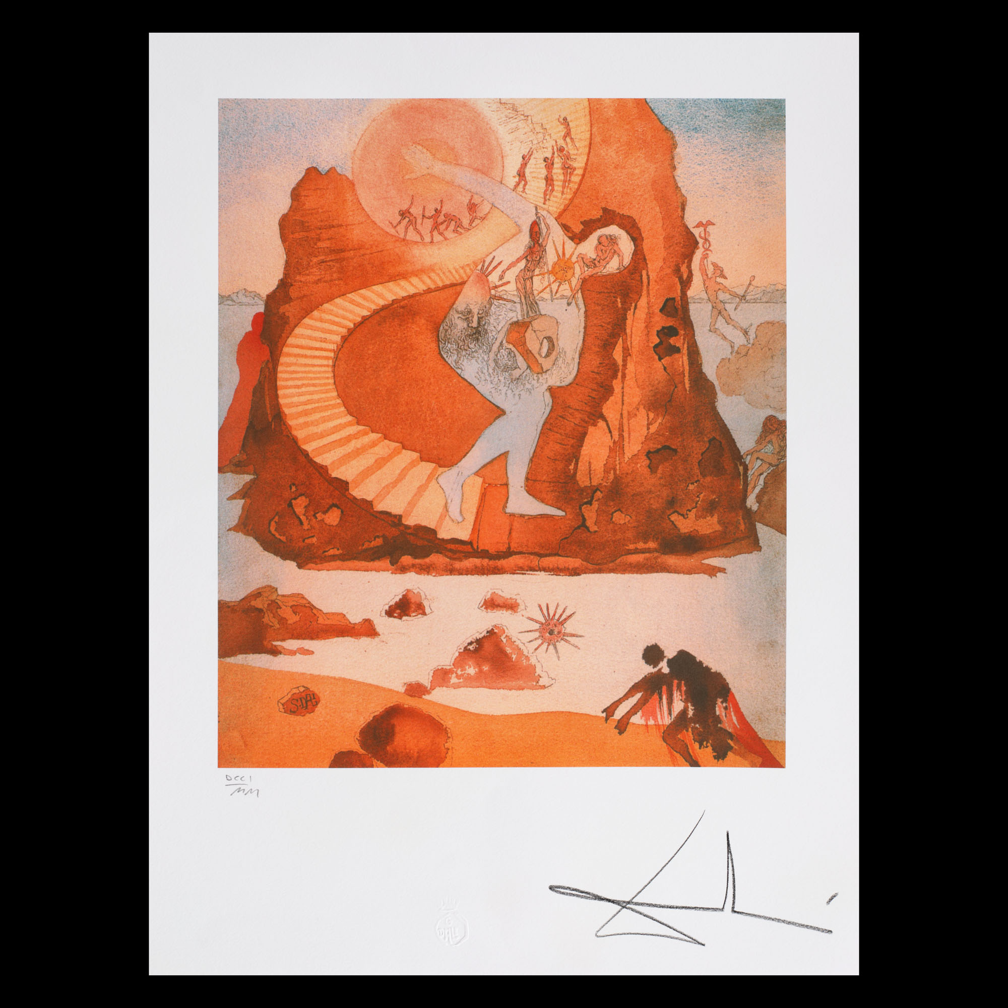 semnat dreapta jos, sub cadru, "Dali"; numerotat stânga jos, sub cadru, în creion, "DCCI/MM"; central jos, ștampila editurii, "G. Dali"