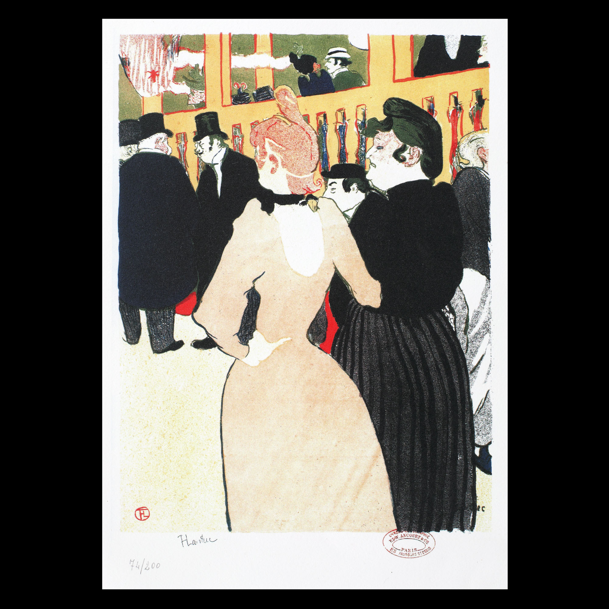 semnat, gravat, stânga jos, sub cadru, ”T. Lautrec”; semnat, gravat, stânga jos, în monogramă, ”T.L.”; numerotat stânga jos, sub cadru, în creion, ”74/200”; dreapta jos, ștampila de atelier, ”EDW. ANCOURT PARIS”