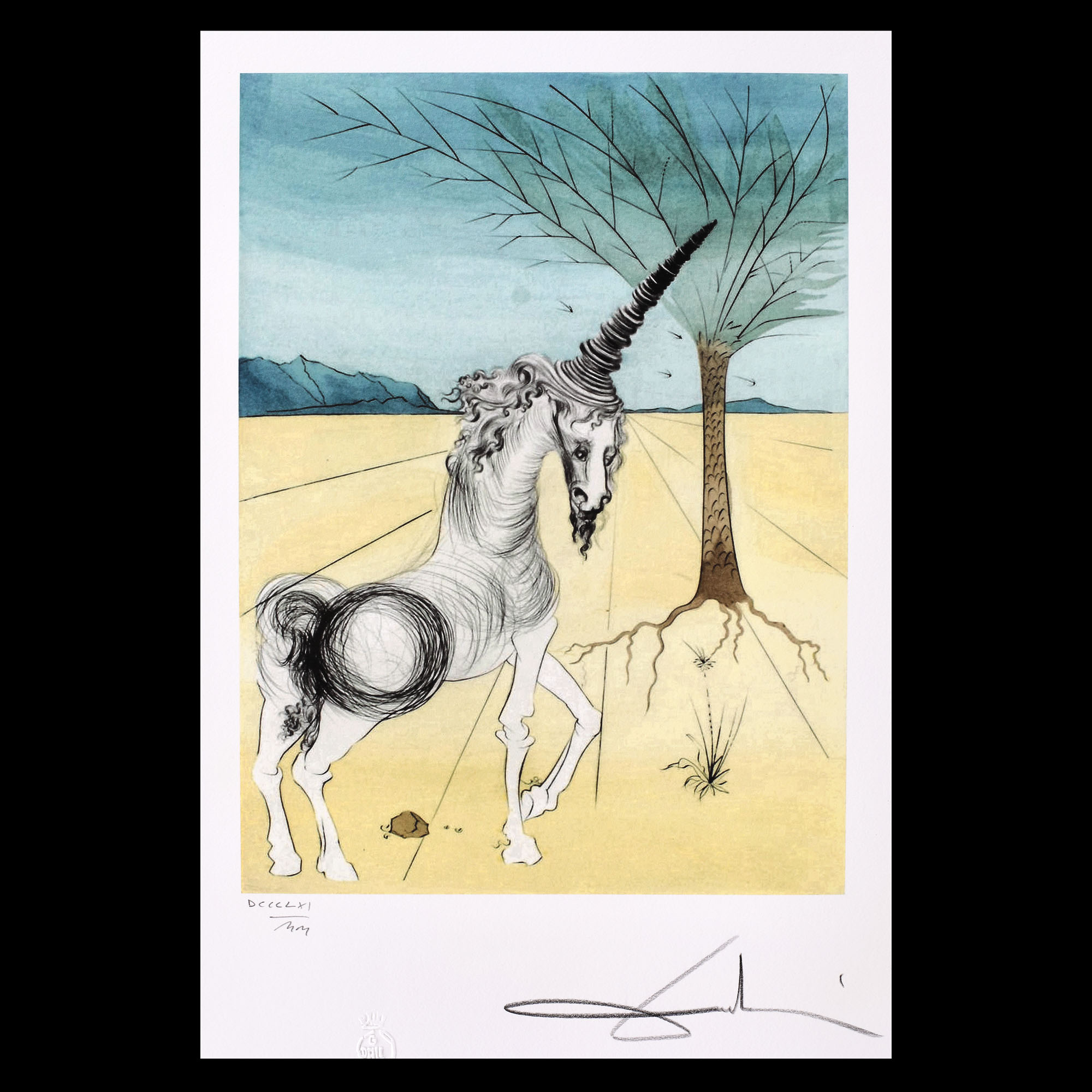 semnat dreapta jos, sub cadru, "Dali"; numerotat stânga jos, sub cadru, în creion, "DCCCLXI/MM"; central jos, ștampila editurii, ”G. Dali”