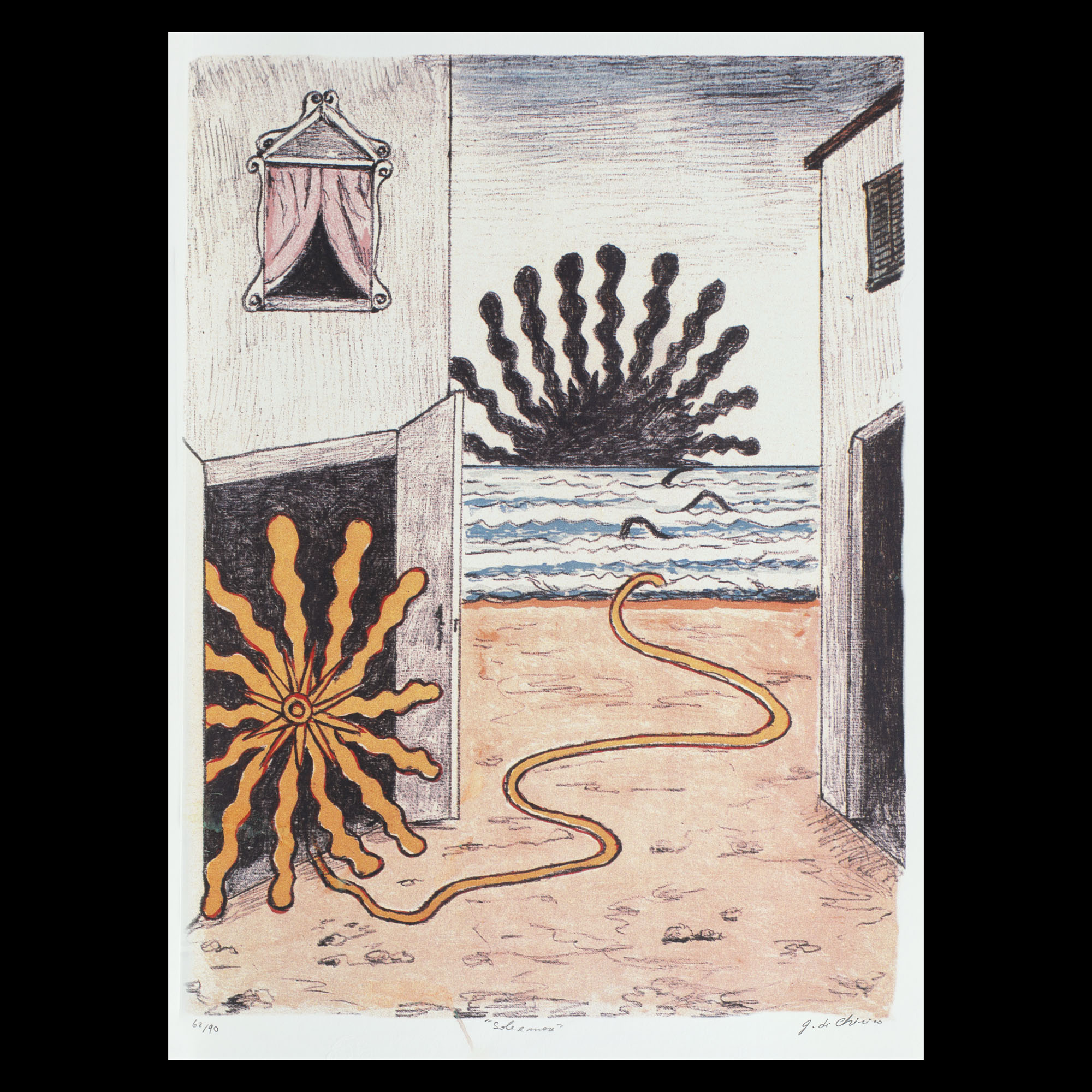 semnat dreapta jos, sub cadru, în creion, ”g. de Chirico”; numerotat stânga jos, sub cadru în creion, ”62/90”; intitulat central jos, ”Sole amore”