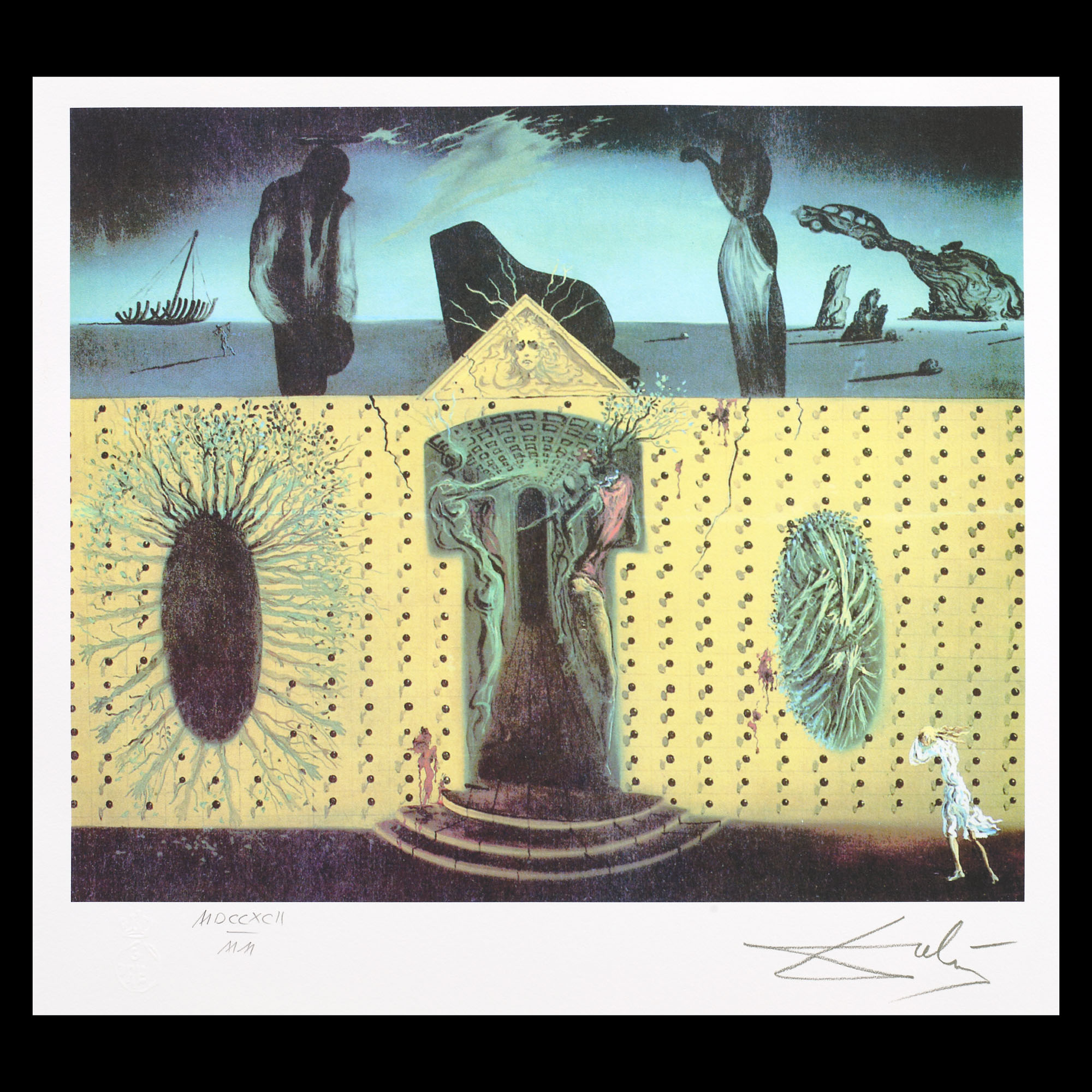 semnat dreapta jos, sub cadru, "Dali"; numerotat stânga jos, sub cadru, în creion, "MDCCXCII/MM"; stânga jos, sub cadru, ştampila editurii, "G. Dali"