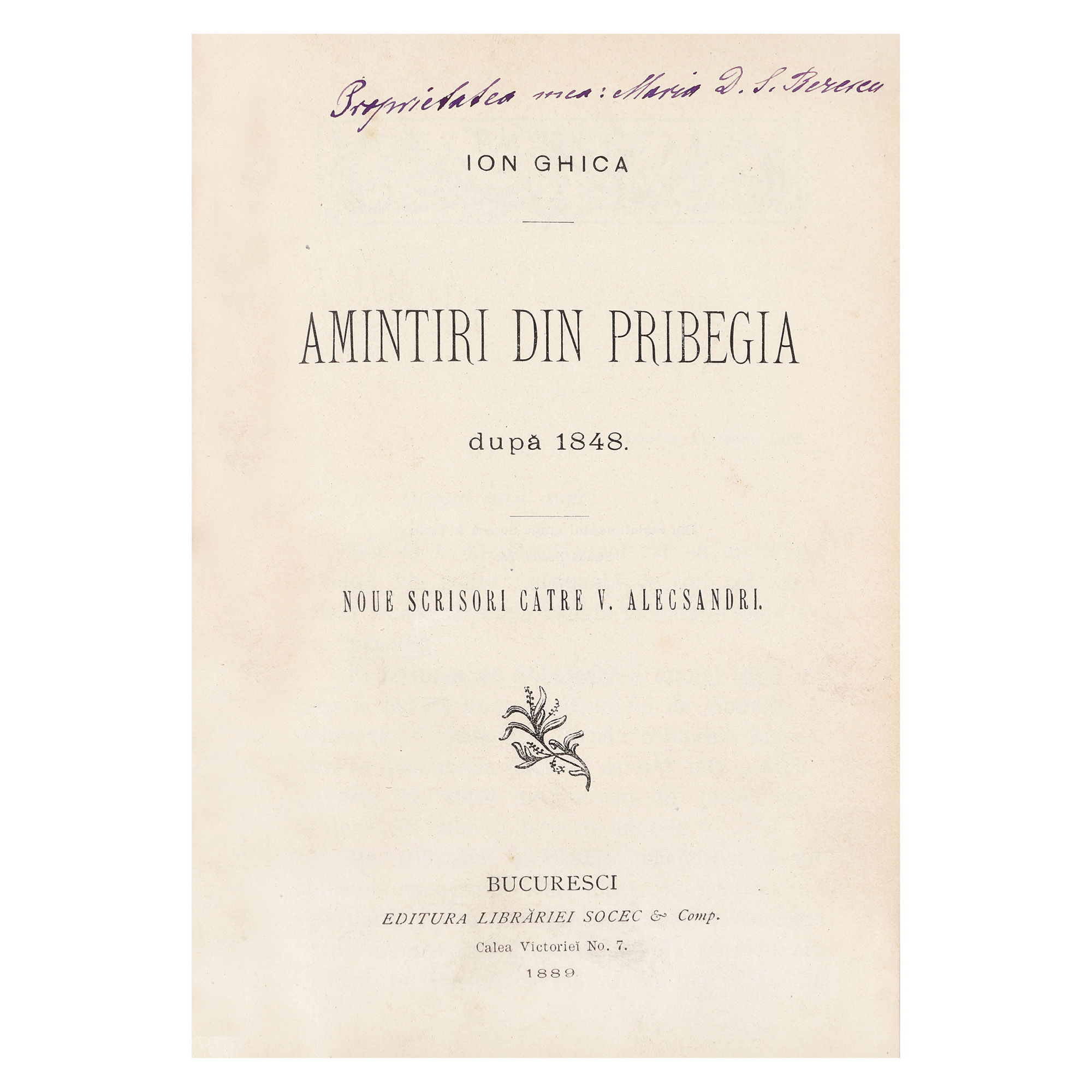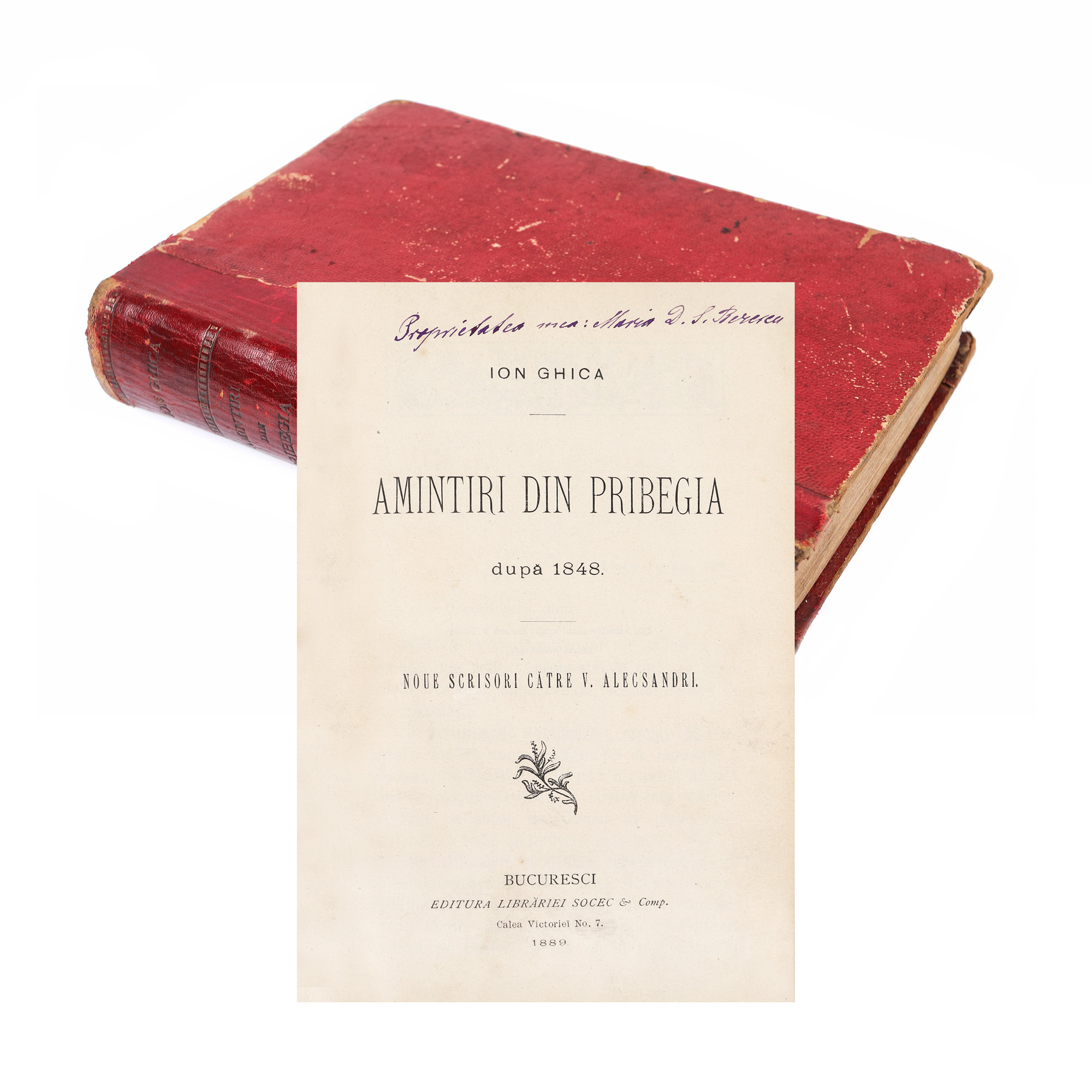 179. "Amintiri din pribegia după 1848", de Ion Ghica, București, 1889, cu ex-libris, provine din colecția criticului literar Șerban Cioculescu