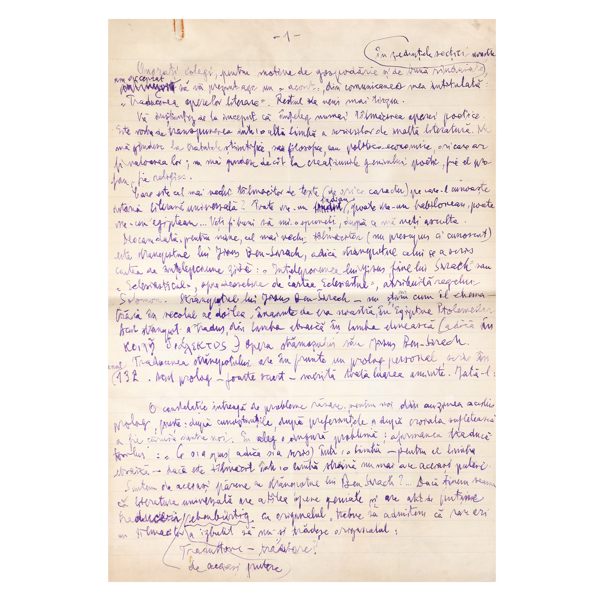 70A. Amplu manuscris al unui discurs rostit de Gala Galaction pe tema literaturii universale și române și a relației dintre ele, rostit la Academia Română, cca. 1950, provine din colecția istorică Șerban Țuculescu-Maria Galaction