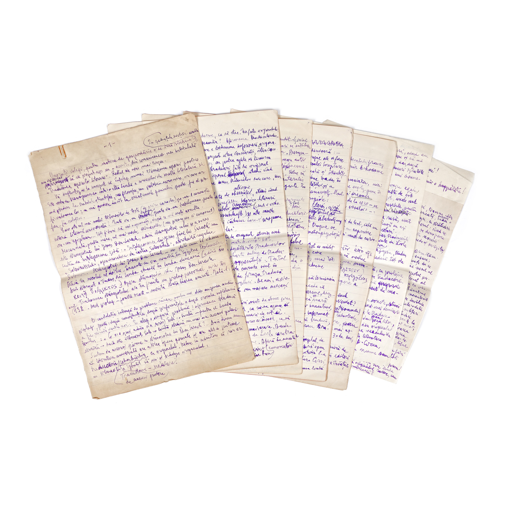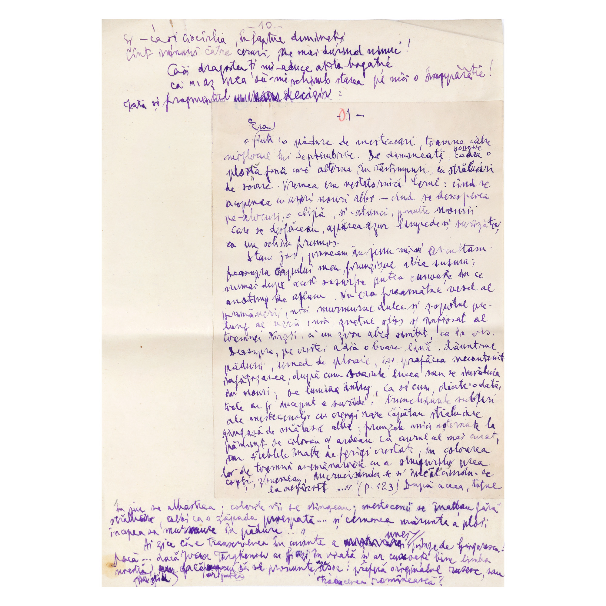 Cele 10 file ale manuscrisului sunt redactate cu cerneală violet și cuprind numeroase corecturi, adăugiri și completări făcute pe text de autor.