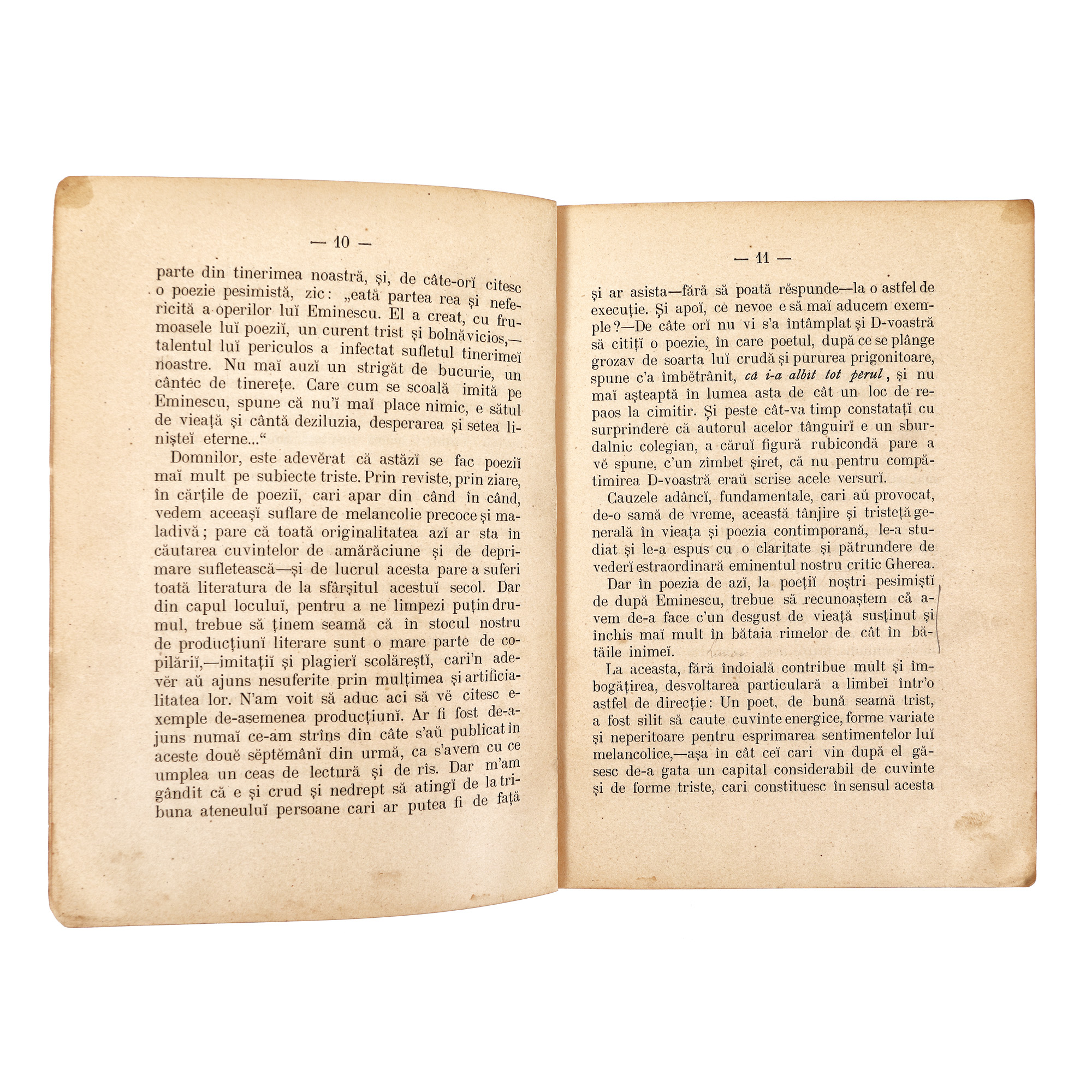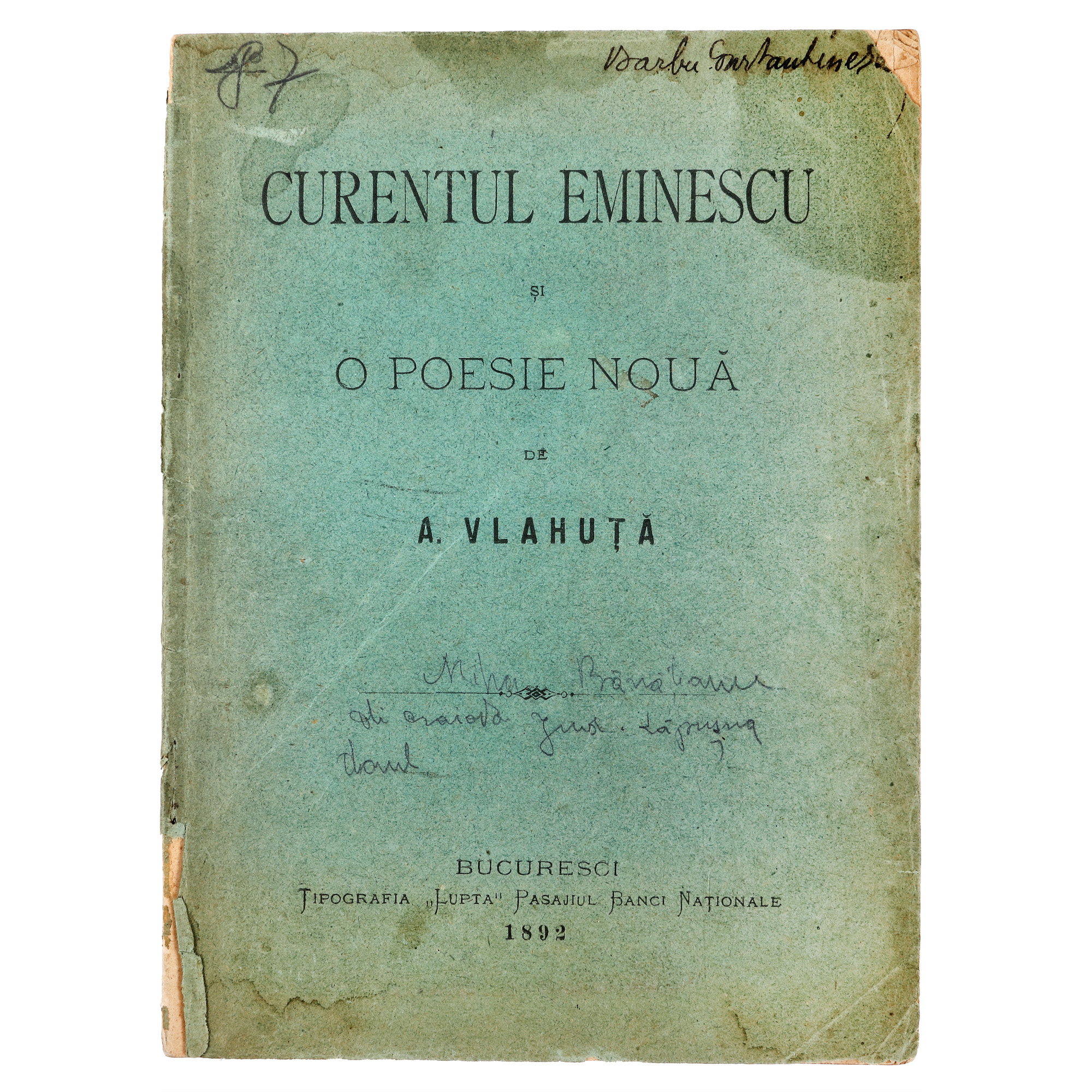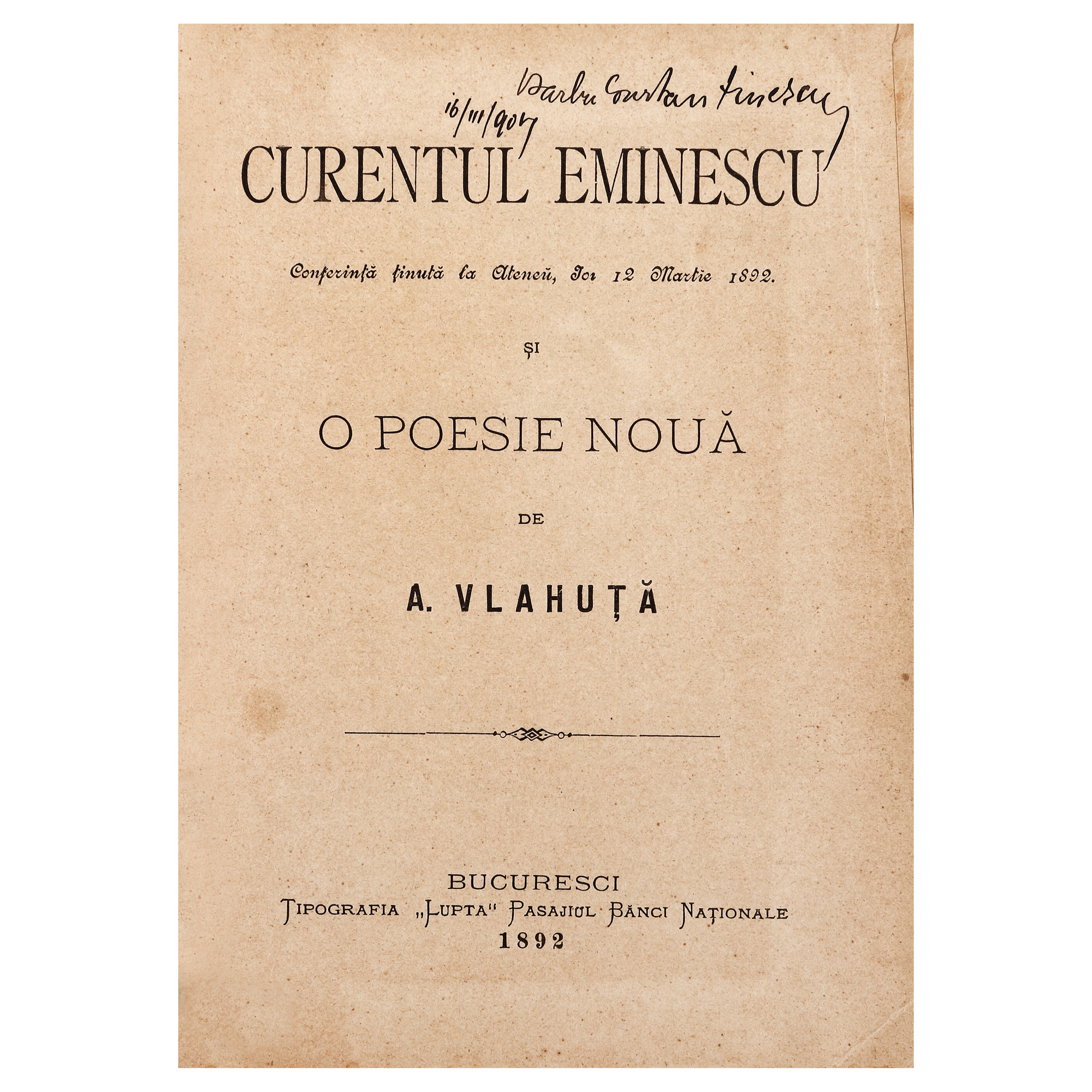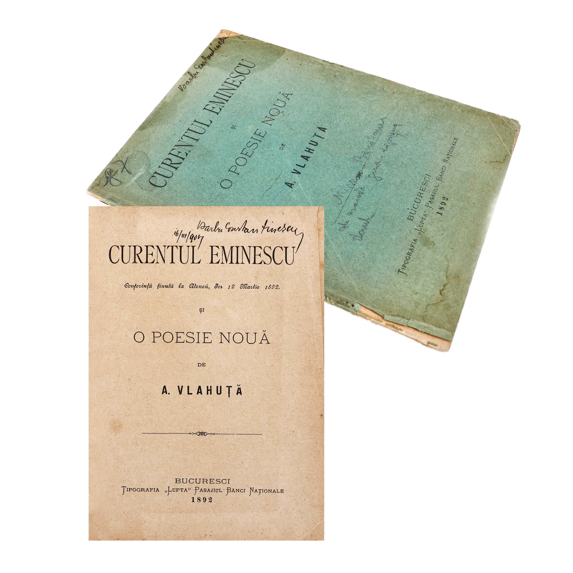 138. ”Curentul Eminescu și o poezie nouă”, de Alexandru Vlahuță, București, 1892, cu ex-libris Barbu Constantinescu, provine din colecția criticului literar Șerban Cioculescu