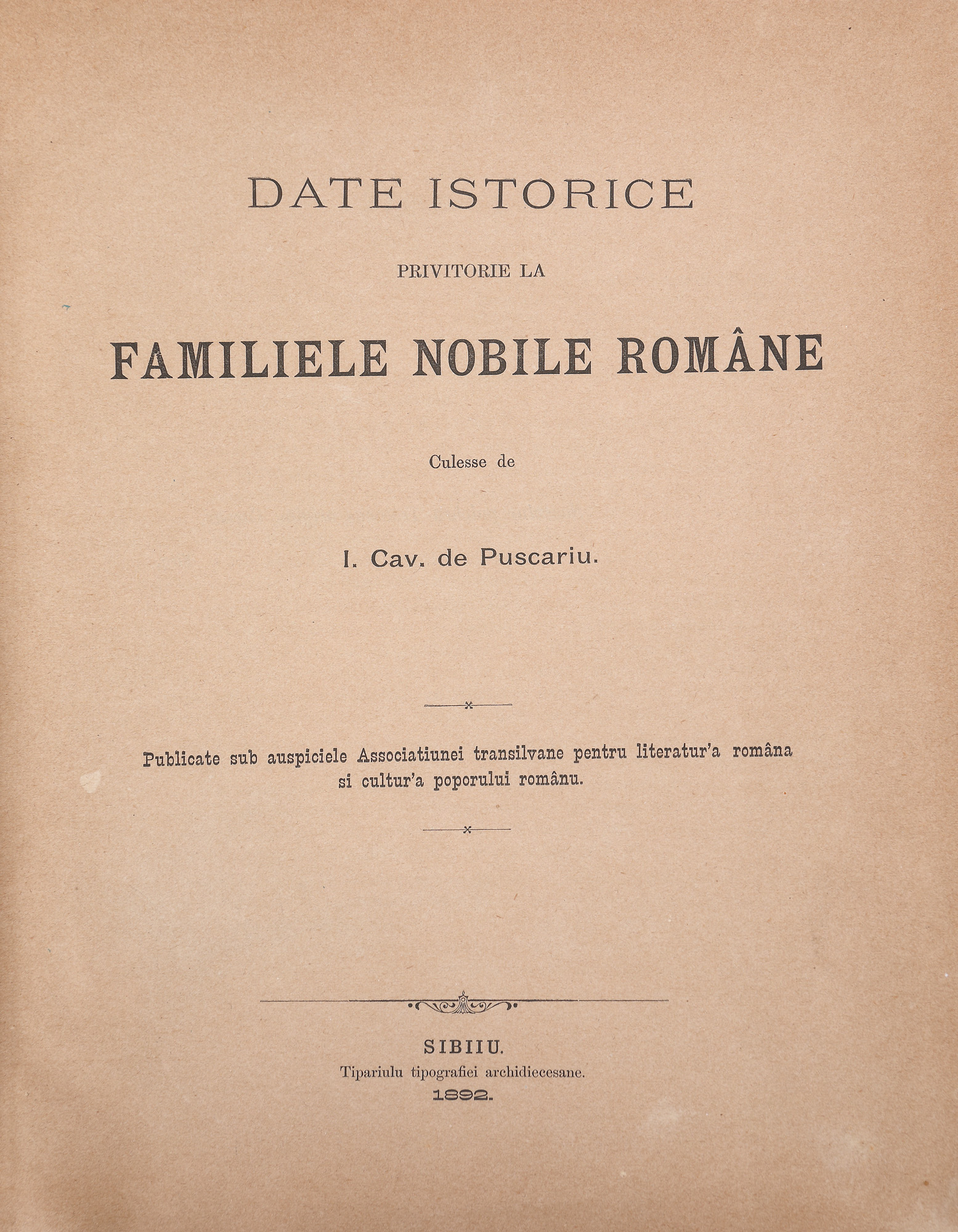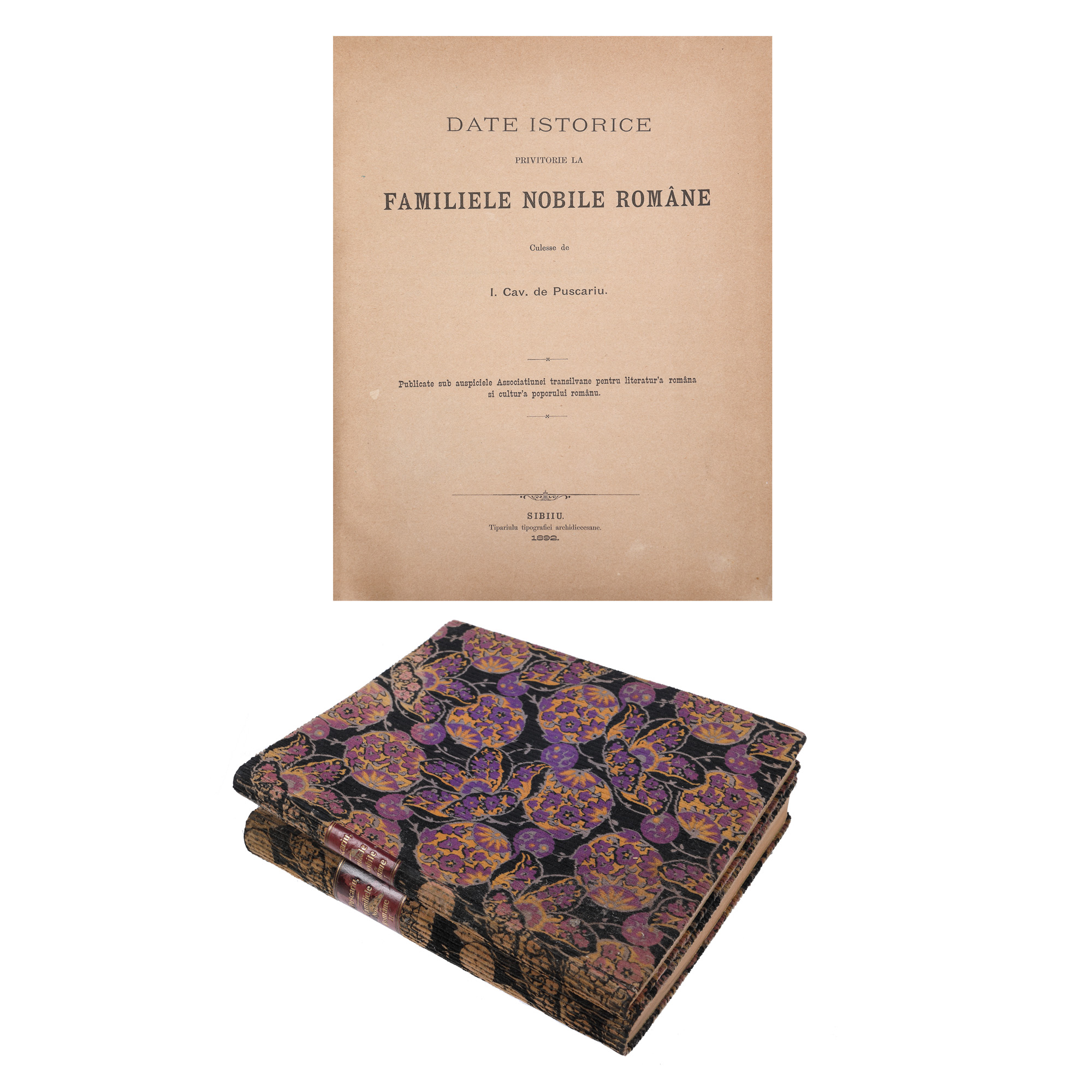 178. "Date istorice privitoare la familiile nobile române", de Ioan Pușcariu, două volume, București, 1892, cu ex-libris pe al doilea volum, provin din colecția criticului literar Șerban Cioculescu
