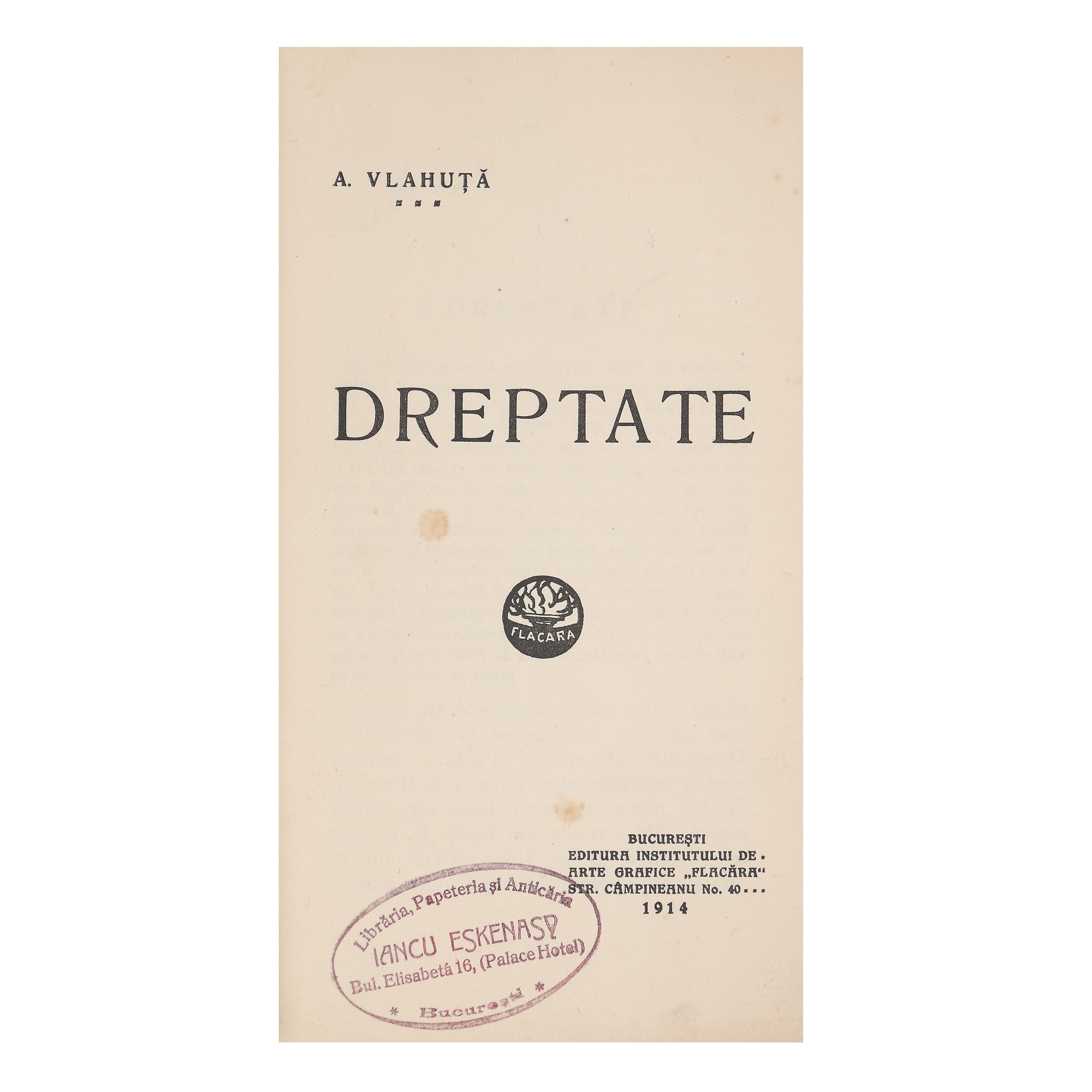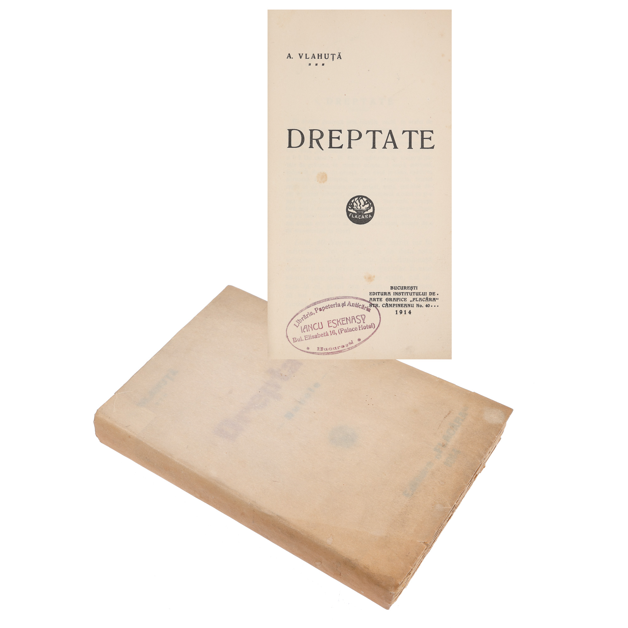 152. "Dreptate", de Alexandu Vlahuță, ediție princeps, București, 1914, cu ex-libris, provine din colecția criticului literar Șerban Cioculescu