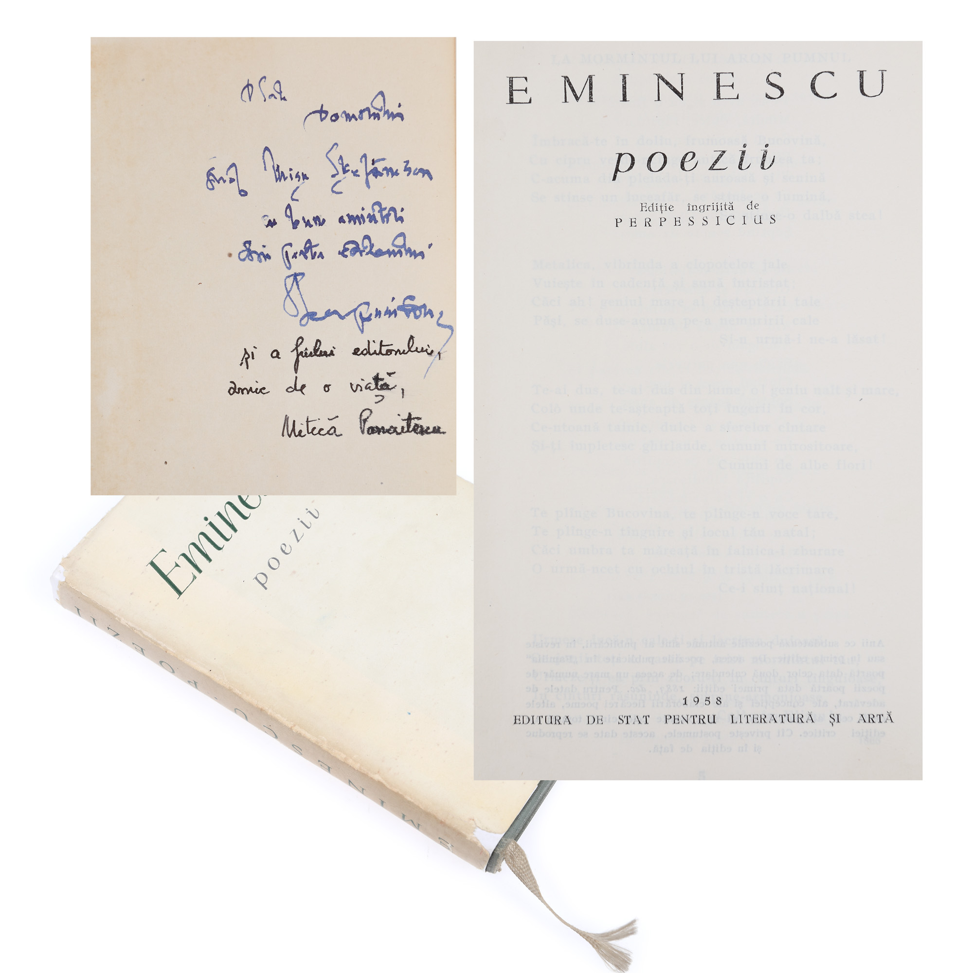 139. ”Eminescu. Poezii”, ediție îngrijită de Perpessicius, București, 1958, cu dedicația și semnătura olografă a editorului și a fiului acestuia, Mitică Panaitescu