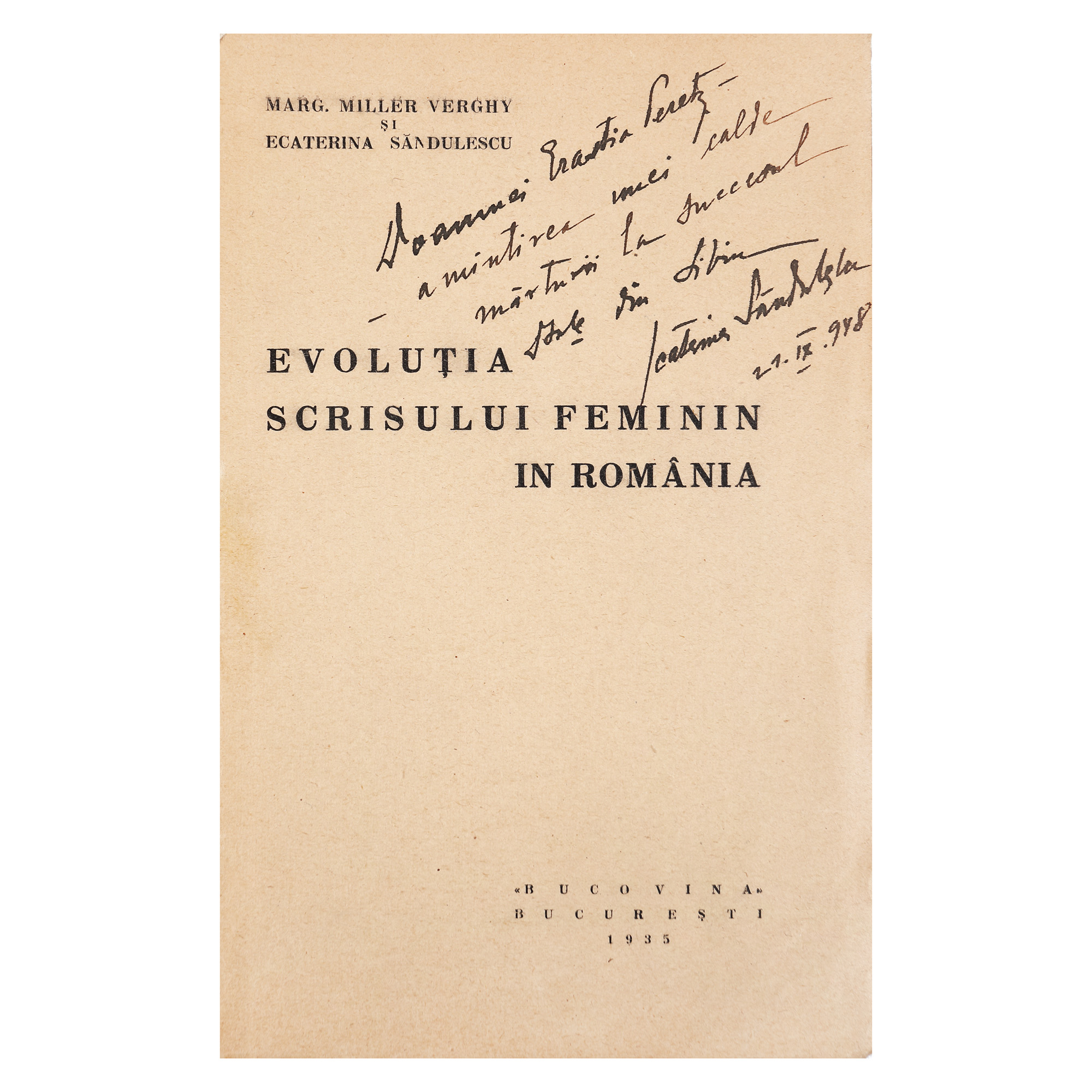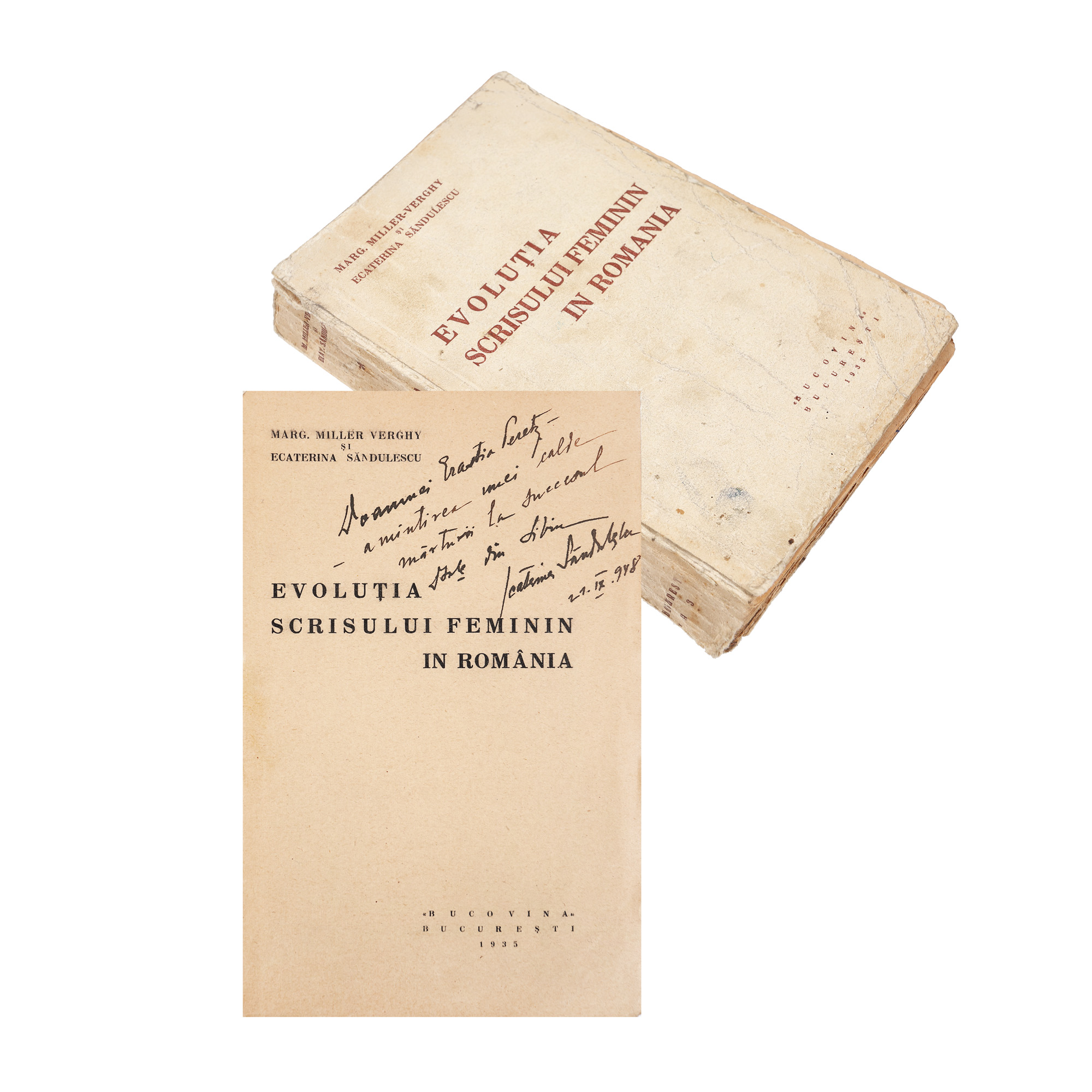 101. ”Evoluția scrisului feminin în România”, de Mărgărita Miller-Verghi și Ecaterina Săndulescu, București, 1935, cu dedicația Ecaterinei Săndulescu către poeta Erastia Peretz (Miss România 1931), provine din colecția criticului literar Șerban Cioculescu