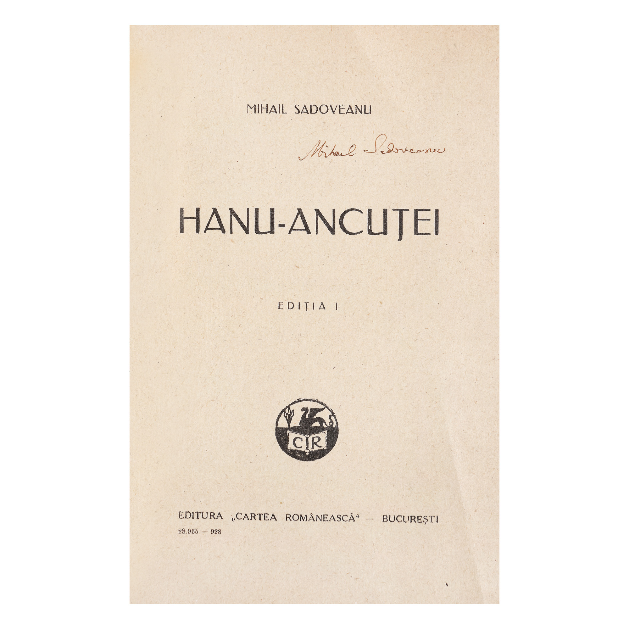 88. ”Hanul Ancuței”, de Mihai Sadoveanu, ediție princeps, București, 1928, cu semnătura olografă a autorului, provine din colecția criticului literar Șerban Cioculescu