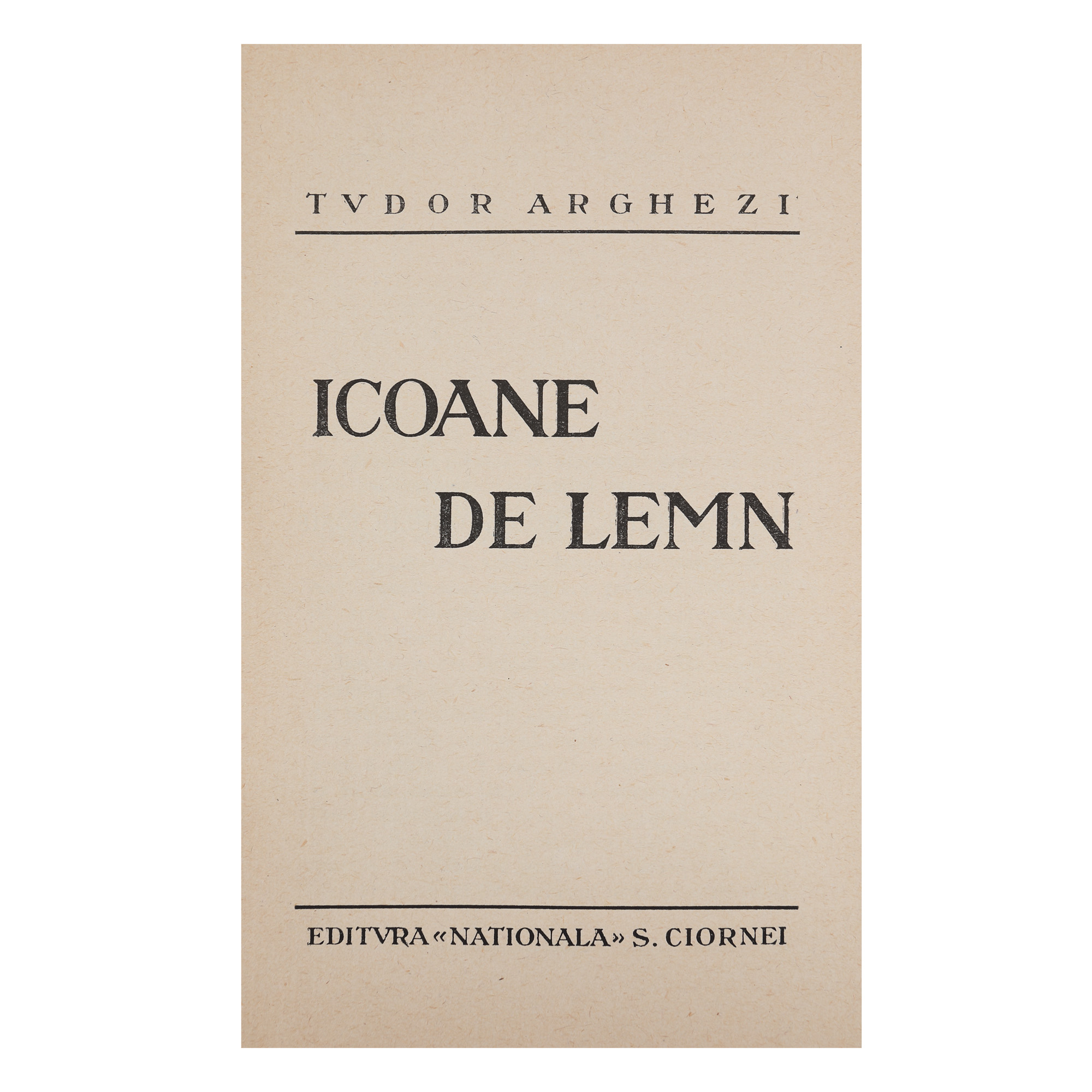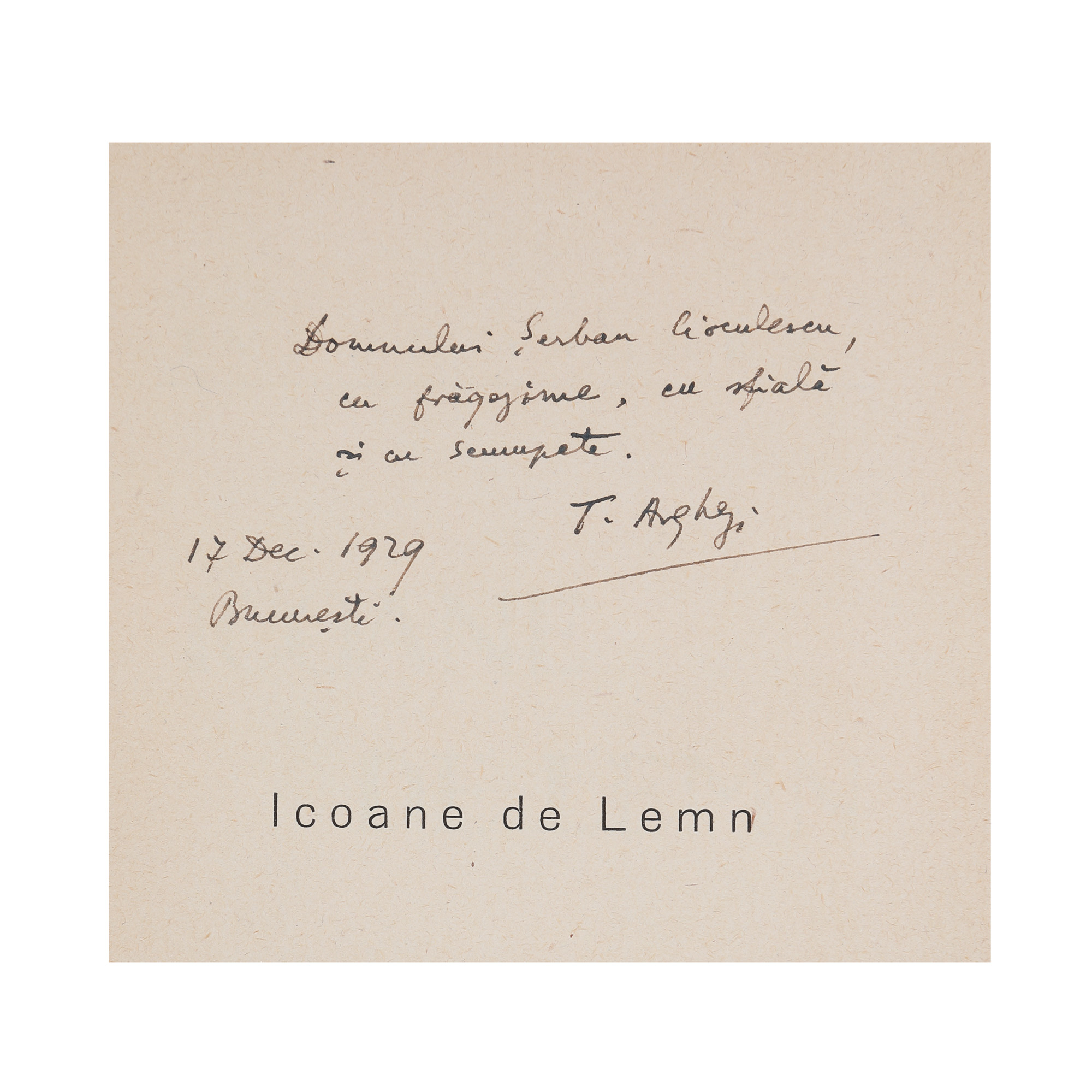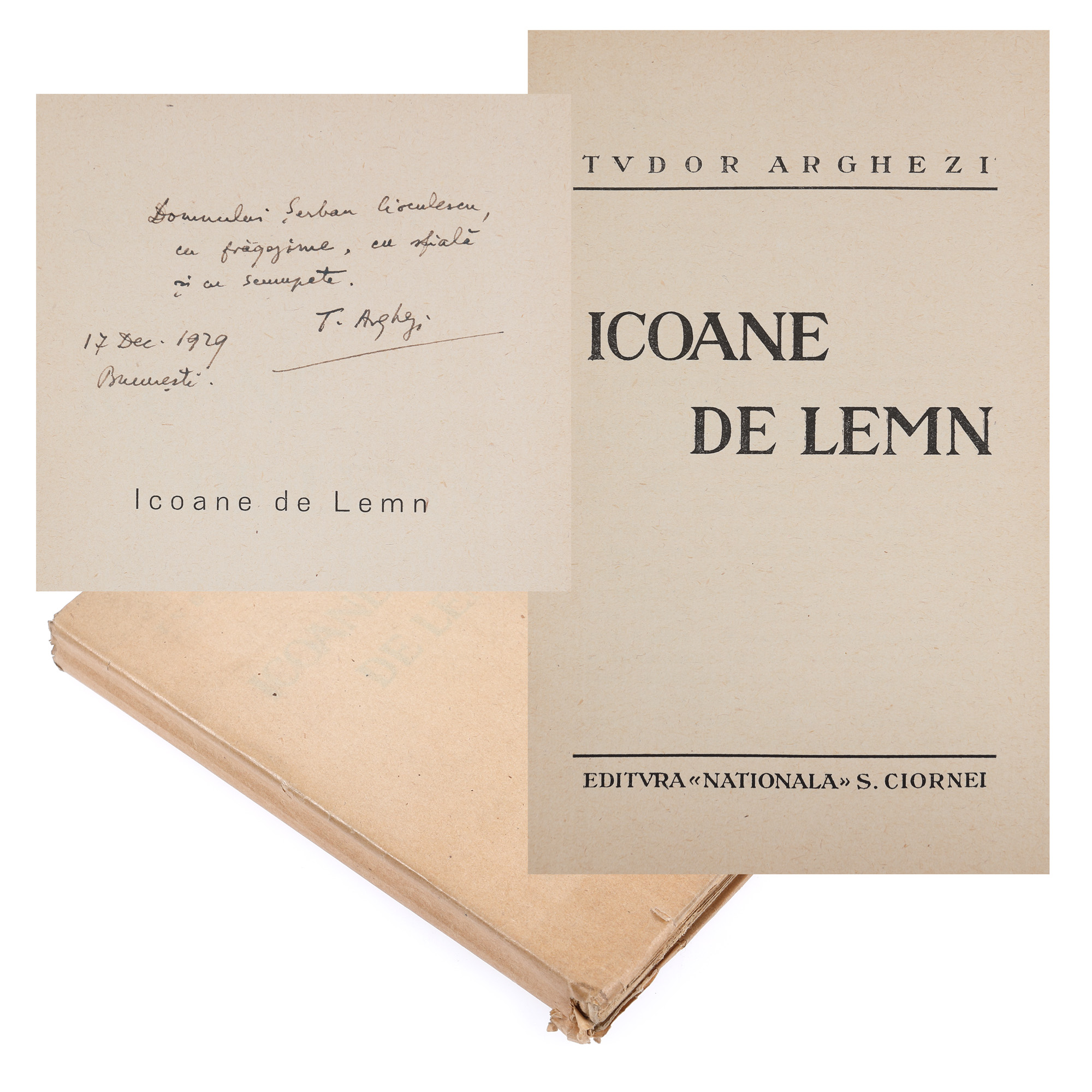 81. ”Icoane de lemn”, de Tudor Arghezi, ediție princeps, București, 1930, cu dedicația autorului către Șerban Cioculescu, provine din colecția criticului literar Șerban Cioculescu