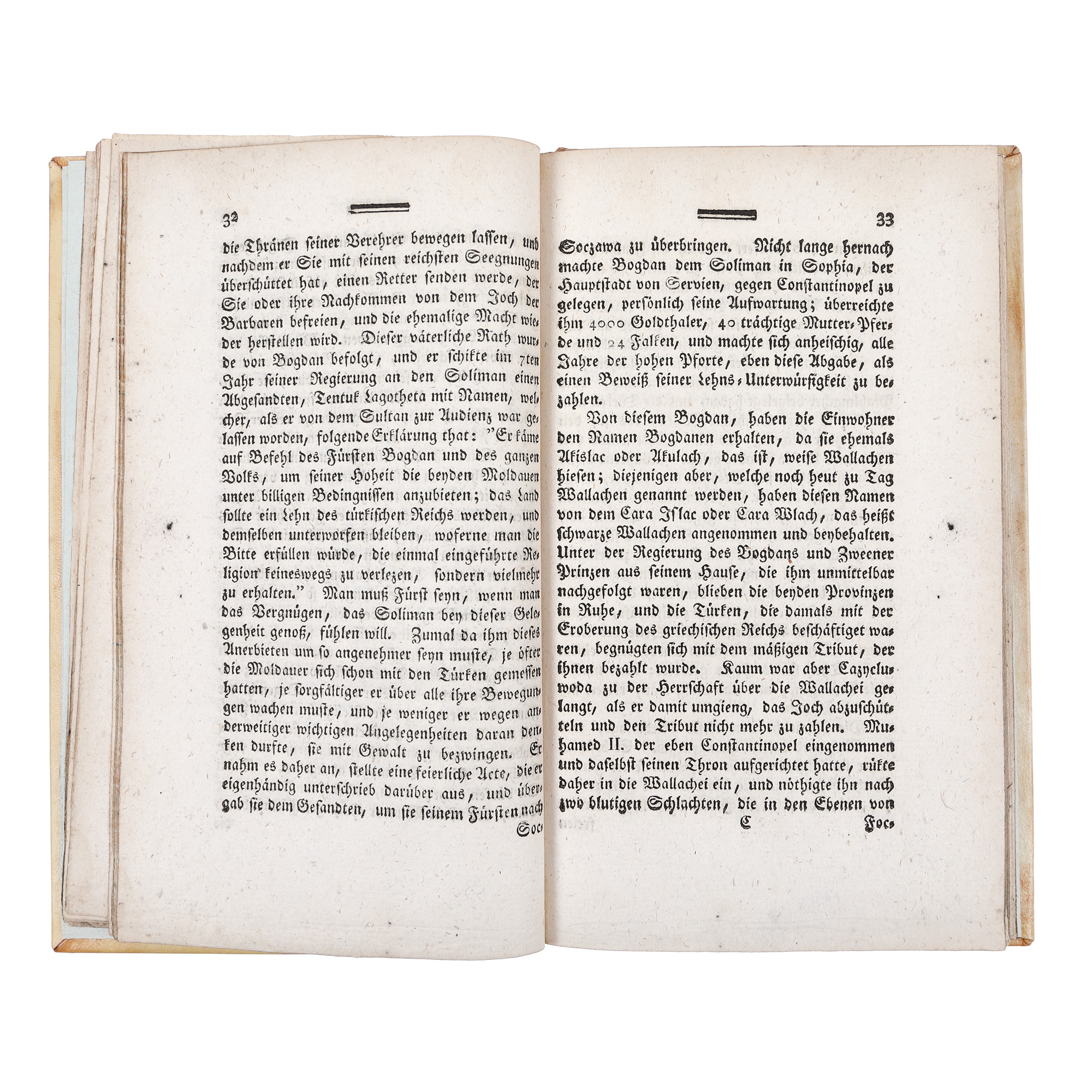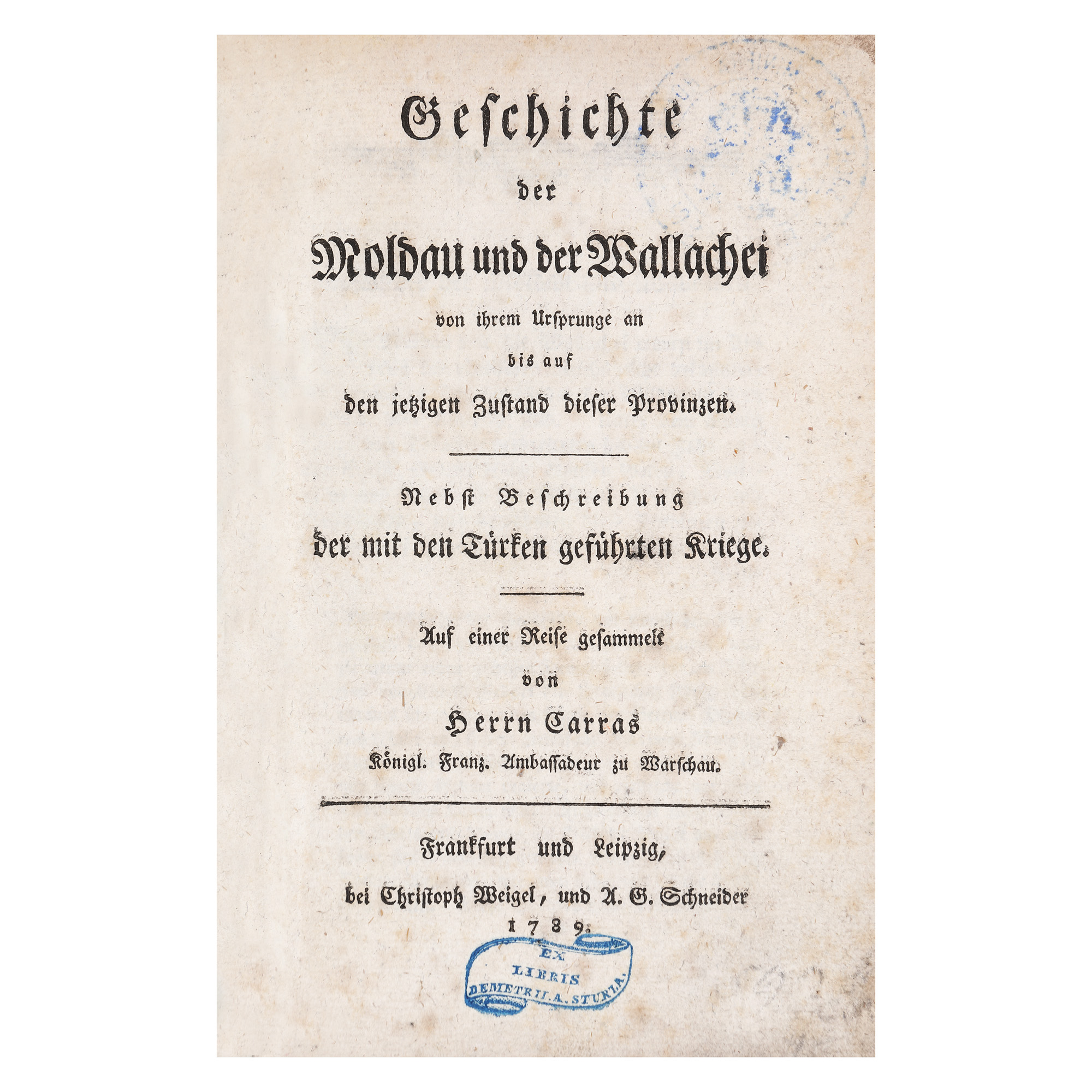Iluministul Jean Louis Carra (1742-1793), revoluționar și neobosit călător din a doua jumătate a secolului al XVIII-lea, a scris această lucrare importantă datorită informațiilor pe care le curpinde referitoare la români. Exemplarul face parte din ediția germană a lucrării, apărută în 1789, o traducere a celei franceze din 1777. Legătura este una bibliofilă din piele iar pe pagina de titlu se găsesc două ex-librisuri, unul al liderului Partidului Național Liberal Dimitrie A. Sturdza, cel de al doilea al Societății Miniere Române.