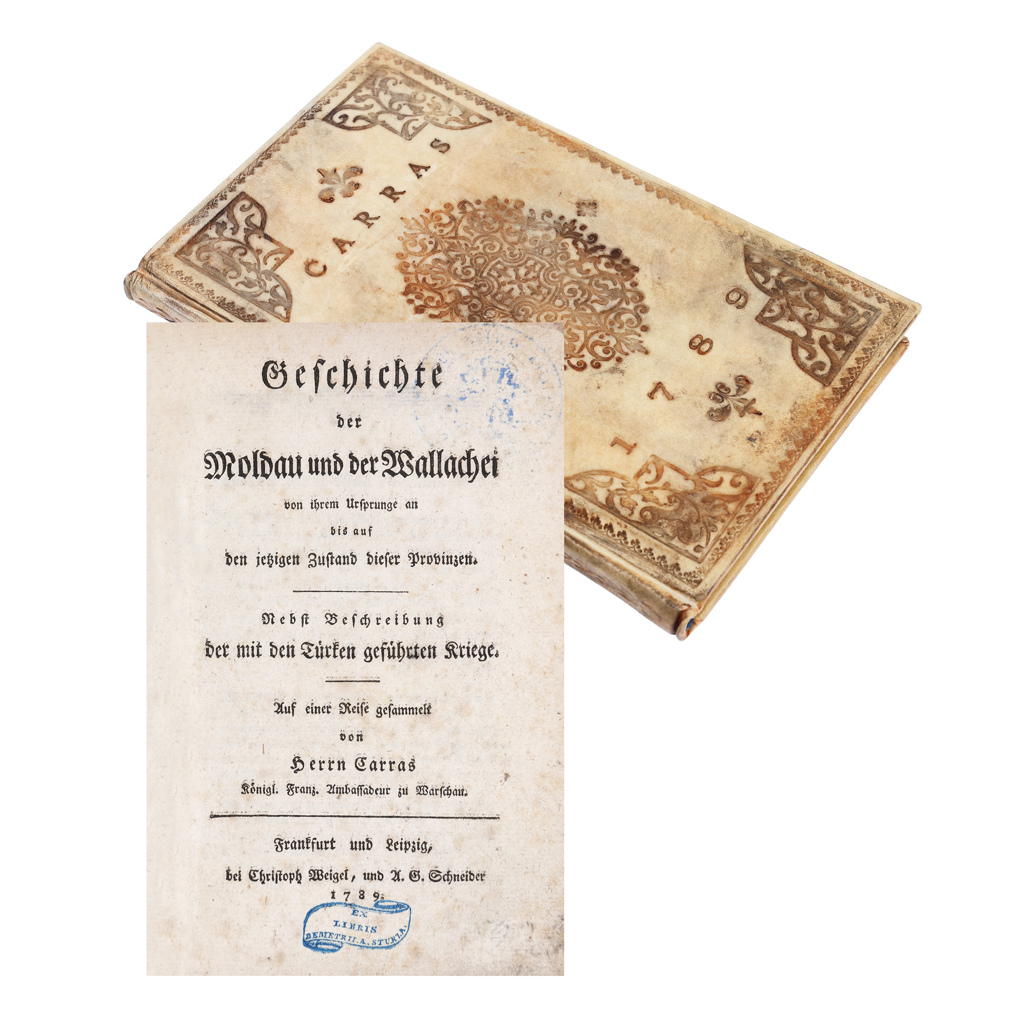 47. ”Istoria Moldovei și a Țării Românești”, de Jean-Louis Carra, germană, Frankfurt și Liepzig, 1789, cu ex-libris Dimitrie A. Sturdza, piesă deosebită