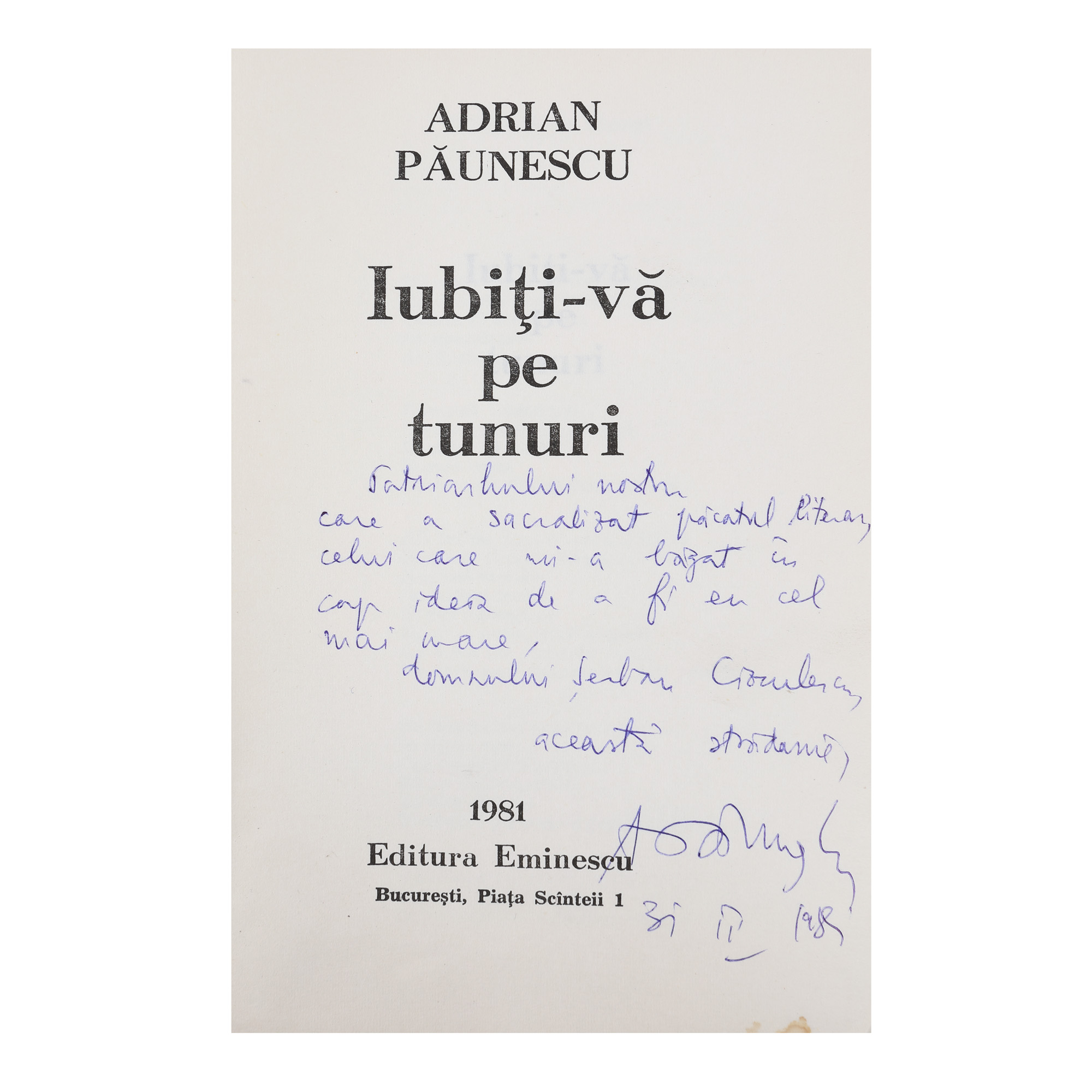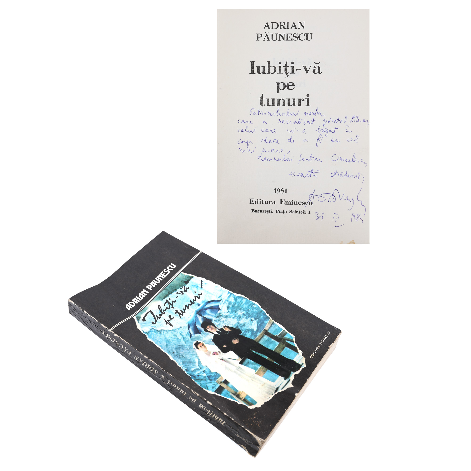 84. ”Iubiți-vă pe tunuri”, de Adrian Păunescu, București, 1981, cu dedicația autorului către Șerban Cioculescu, provine din colecția criticului literar Șerban Cioculescu