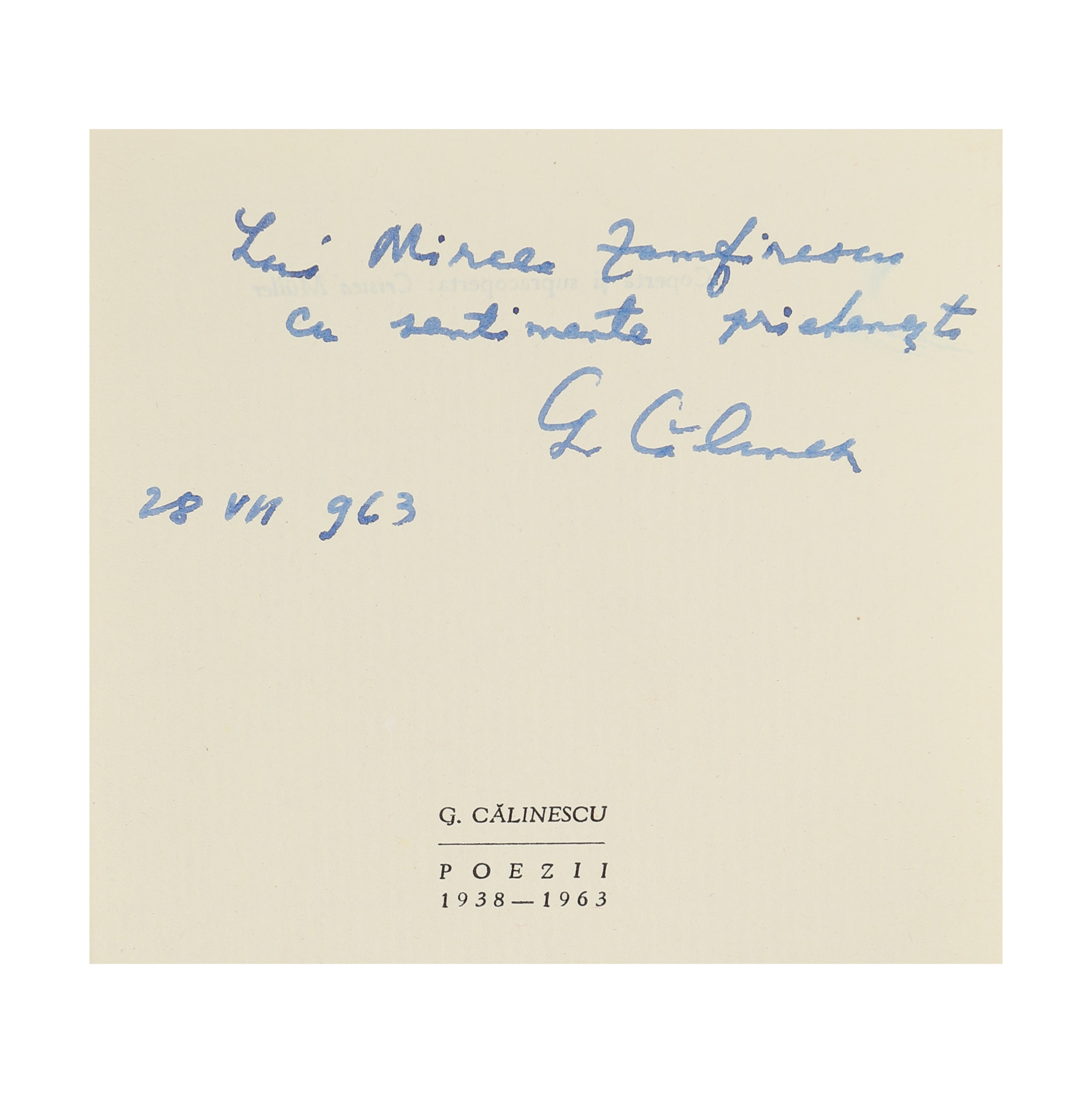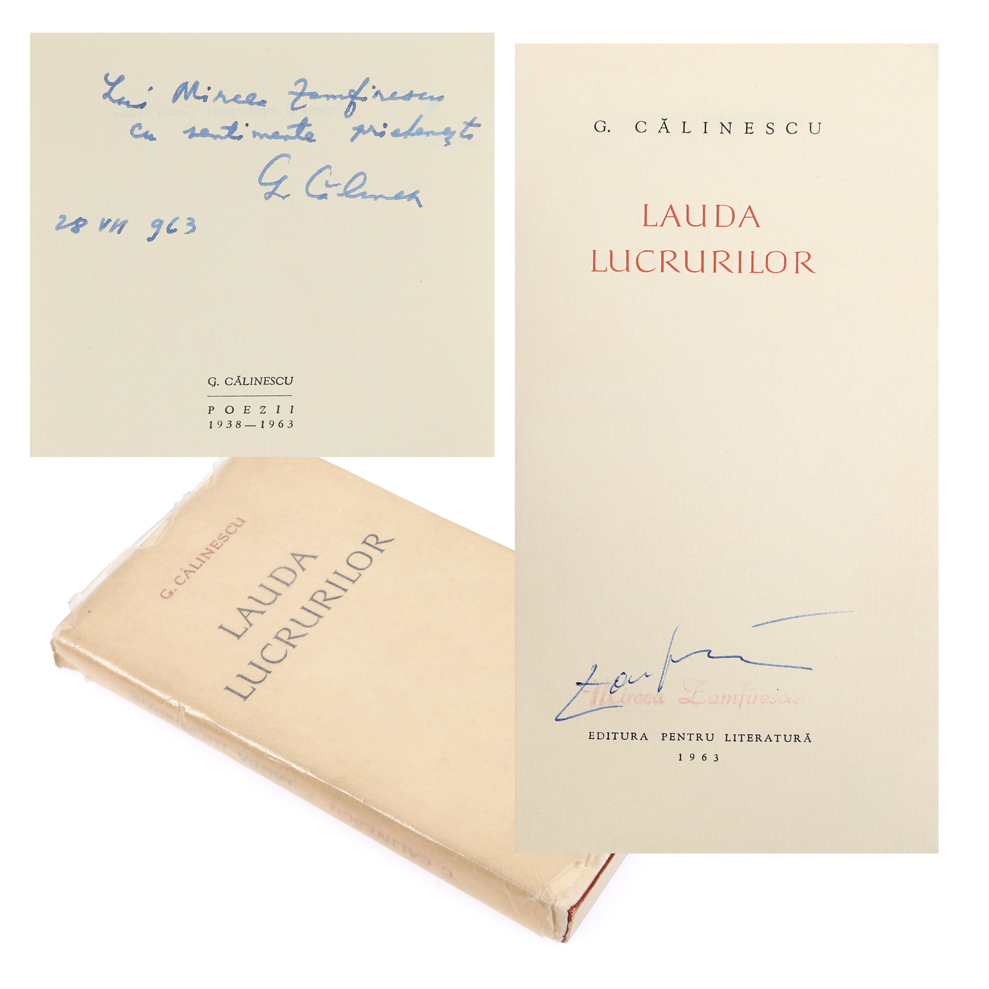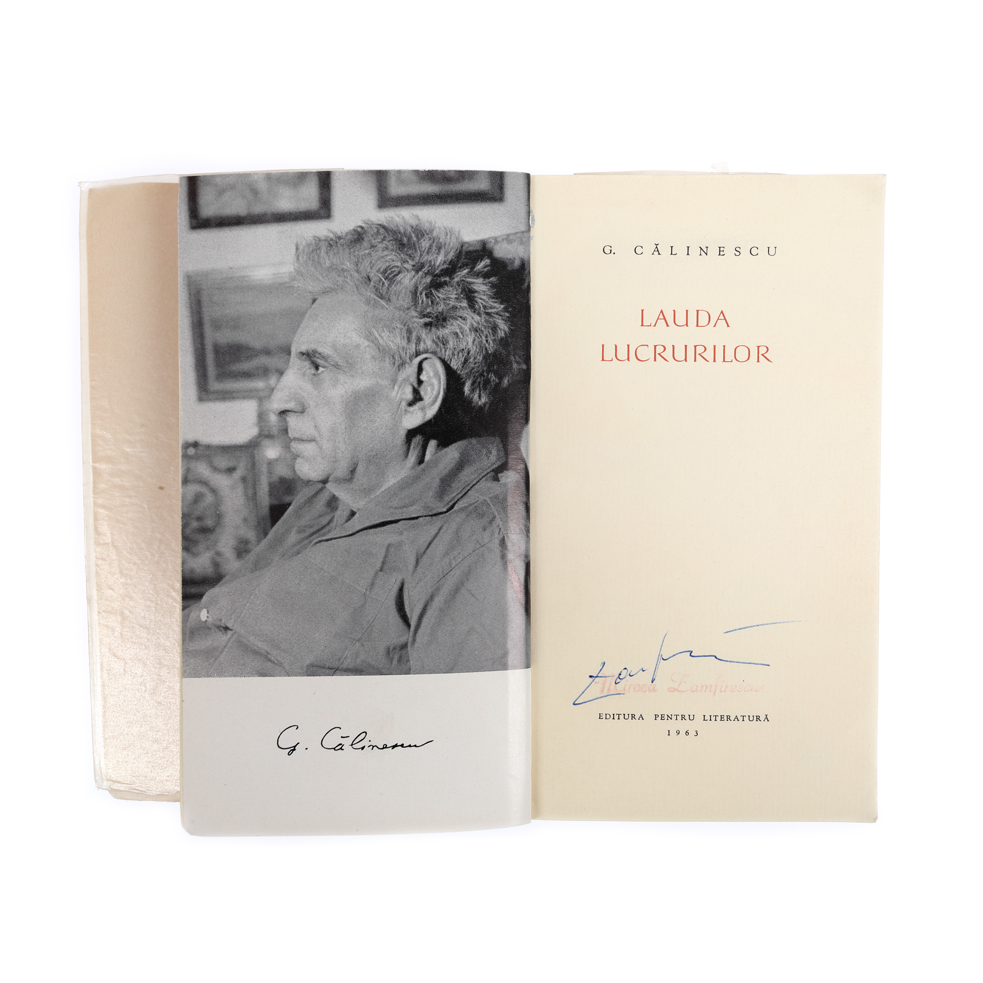 124. ”Lauda lucrurilor”, de George Călinescu, București, 1963, cu dedicația și semnătura olografă a autorului și ex-libris
