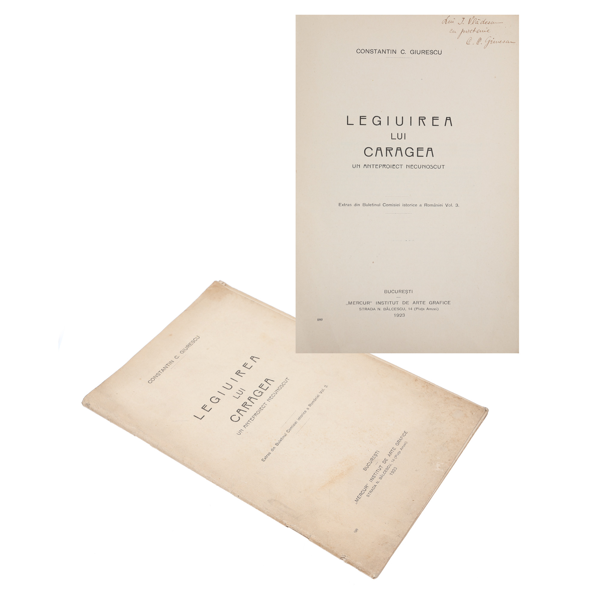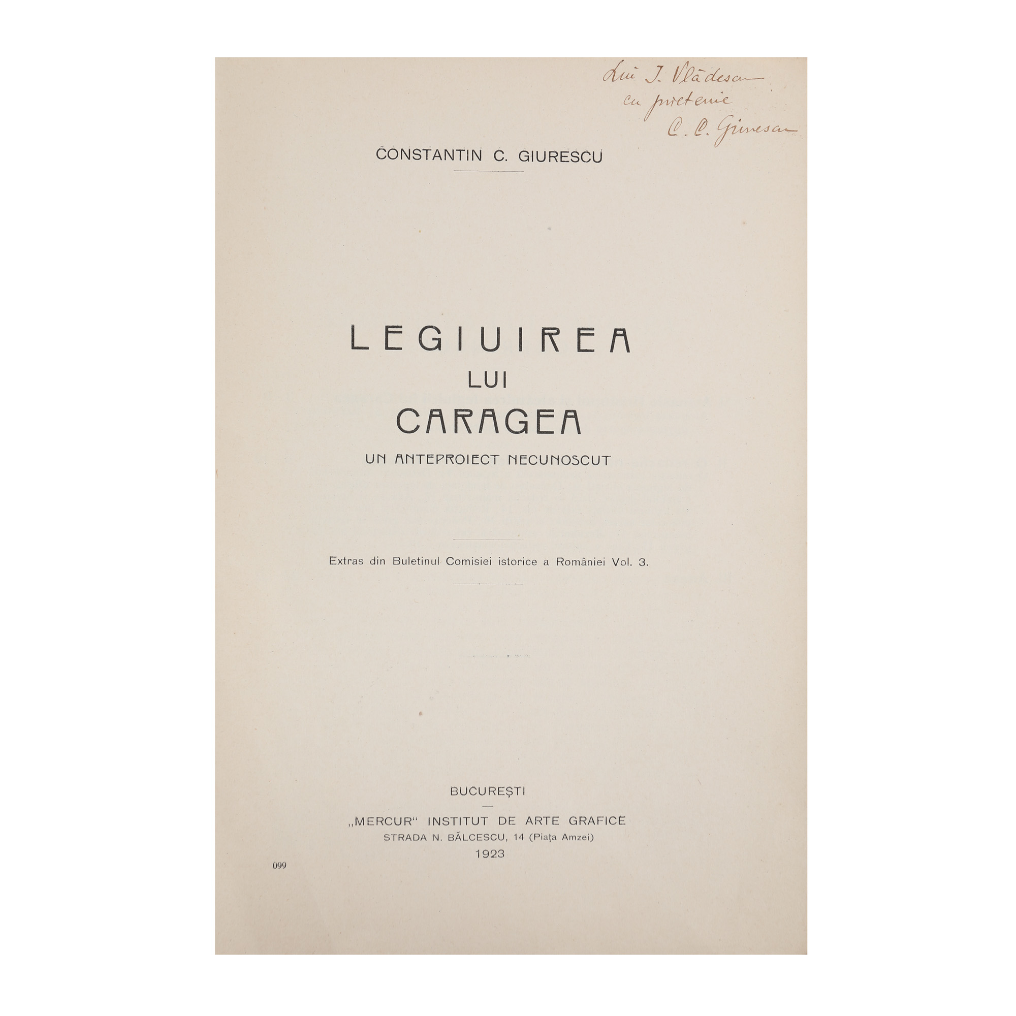 181. ”Legiuirea lui Caragea. Un anteproiect necunoscut”, Constantin Giurescu, București, 1923, cu dedicația autorului către I. Vlădescu, provine din colecția criticului literar Șerban Cioculescu