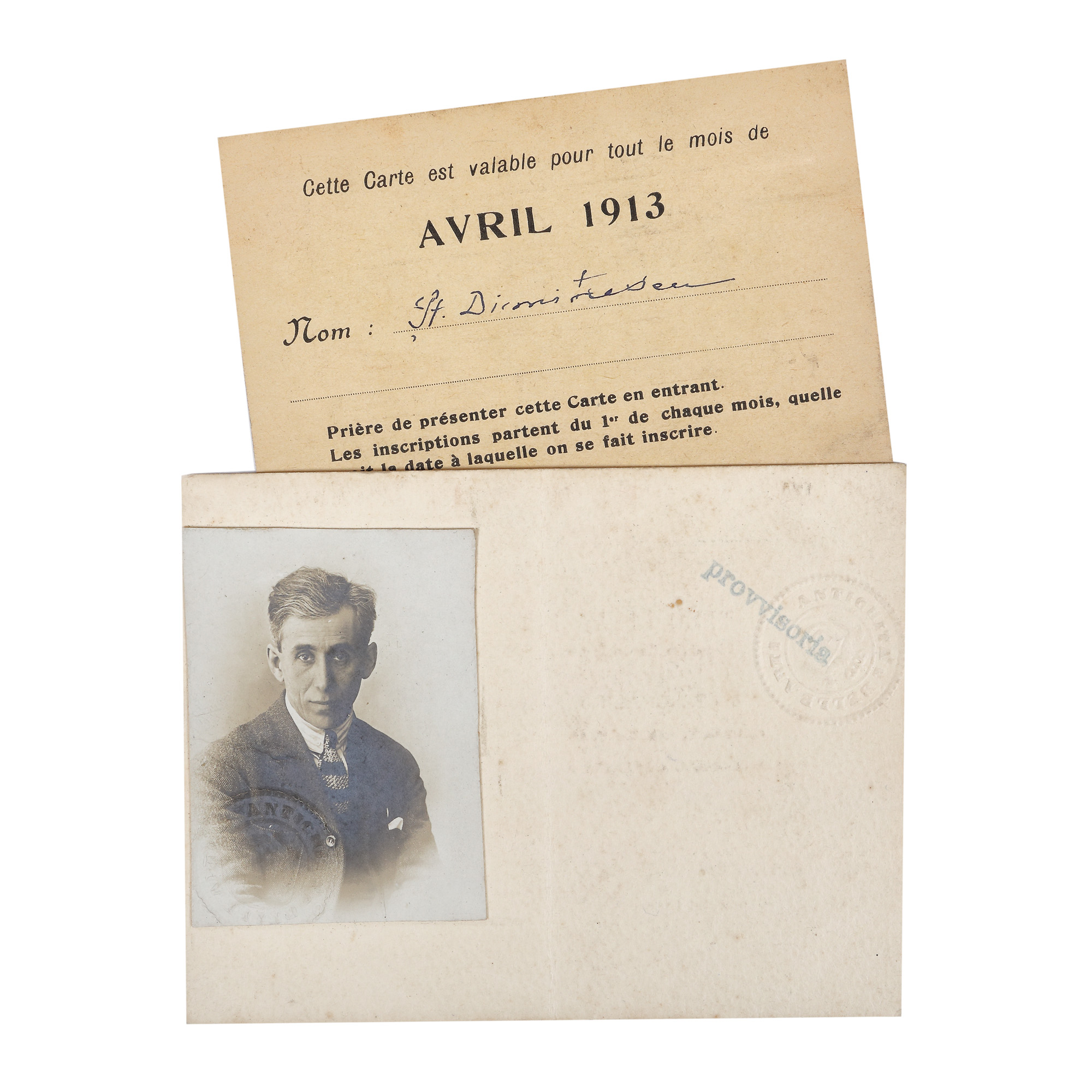 Documentele dovedesc prezența pictorului Ștefan Dimitrescu la Paris pentru a studia la diferite instituții artistice, între 1913 și 1921. Cartea de vizită cuprinde o însemnare olografă a artistului referitoare la adresa atelierului său.