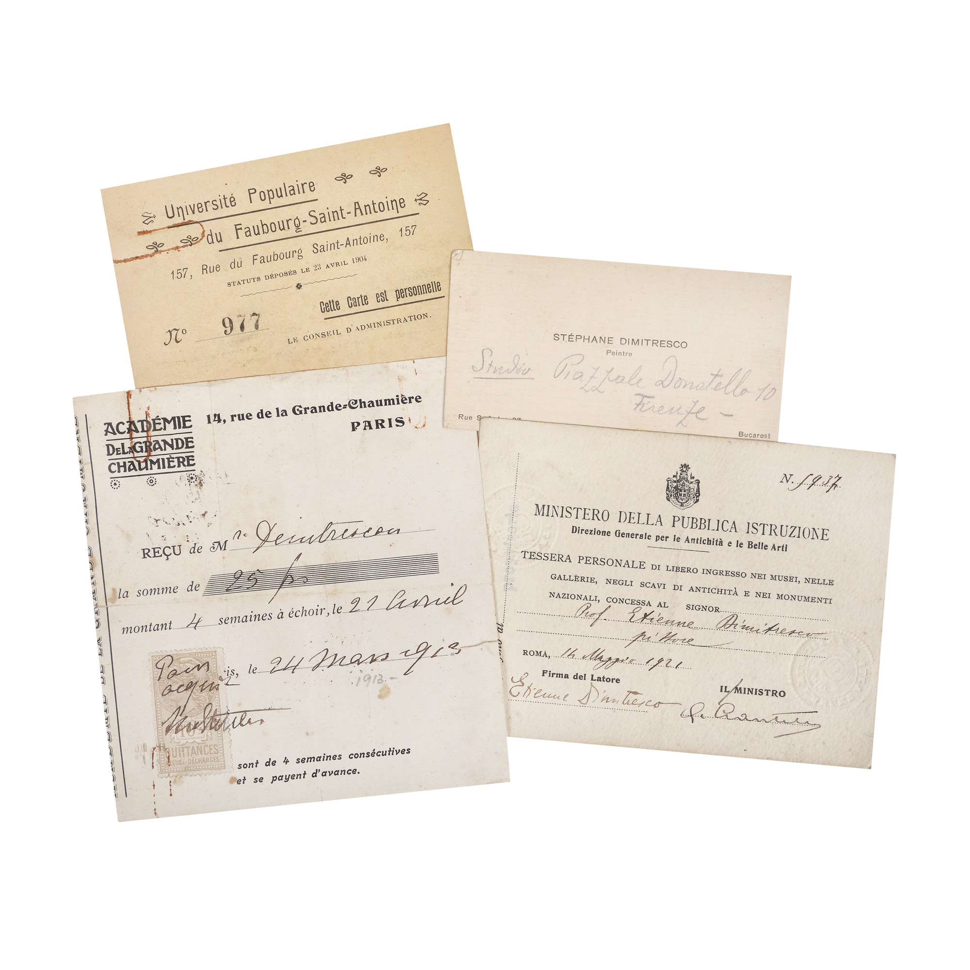 77. Lot format dintr-un document emis de Académie de la Grande Chaumière, din 24 martie 1913, un bilet pentru vizitarea liberă a muzeelor, galeriilor și monumentelor din Roma, emisă de Ministerul Instrucțiunii Publice din Italia cu fotografia artistului, din 14 martie 1921, o legitimație de acces la Universitatea Populară de la Paris pentru luna aprilie 1913 și o carte de vizită în calitatea sa de pictor, toate aparținând lui Ștefan Dimitrescu, 1913-1921