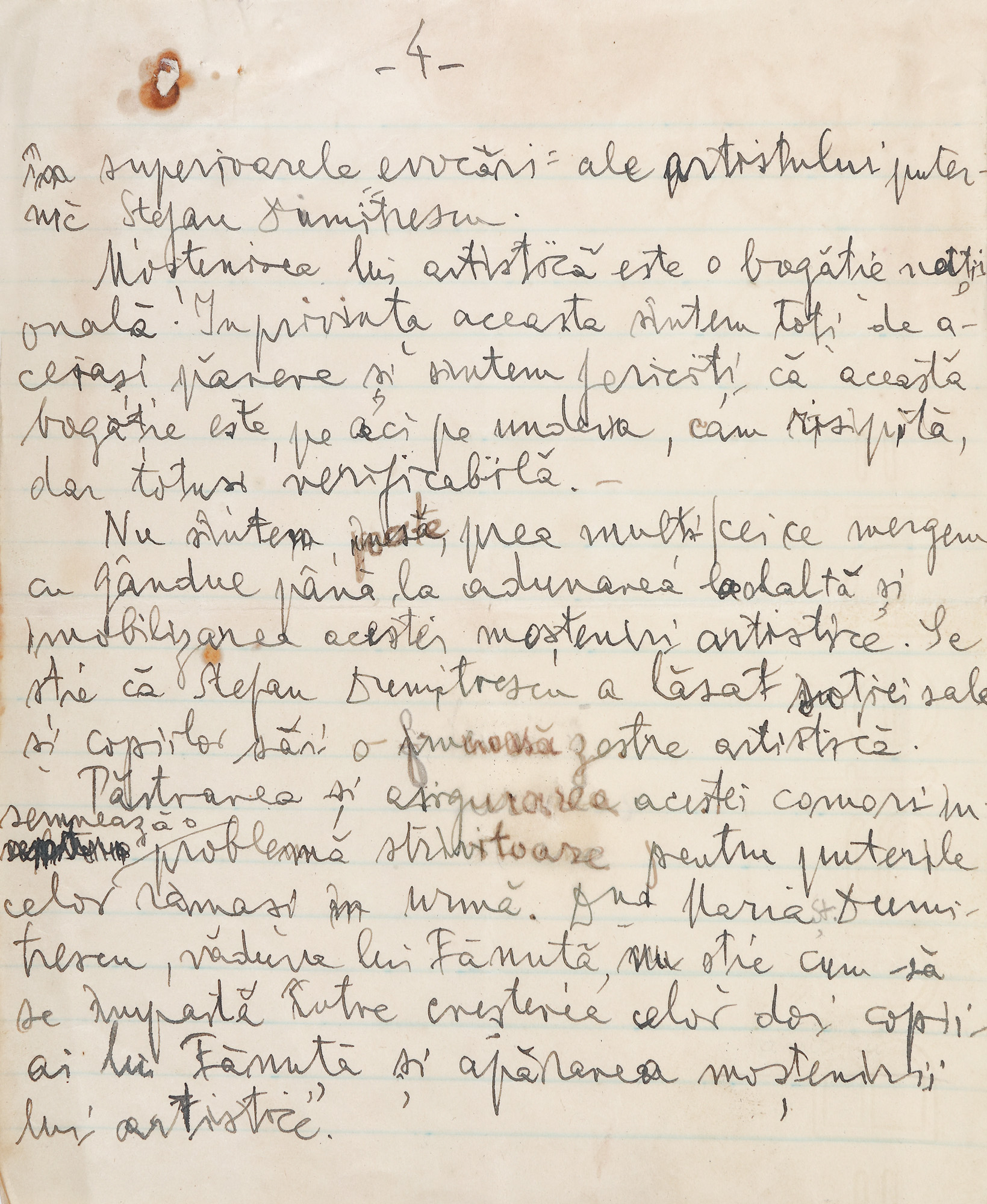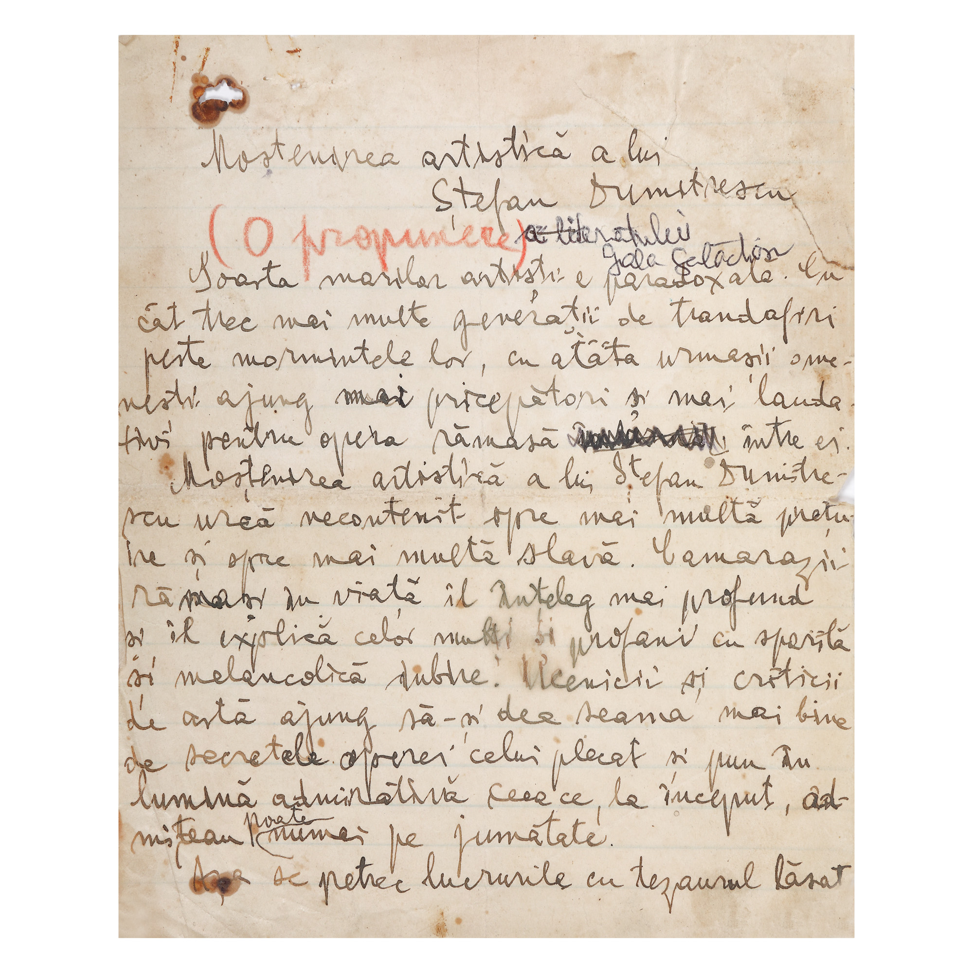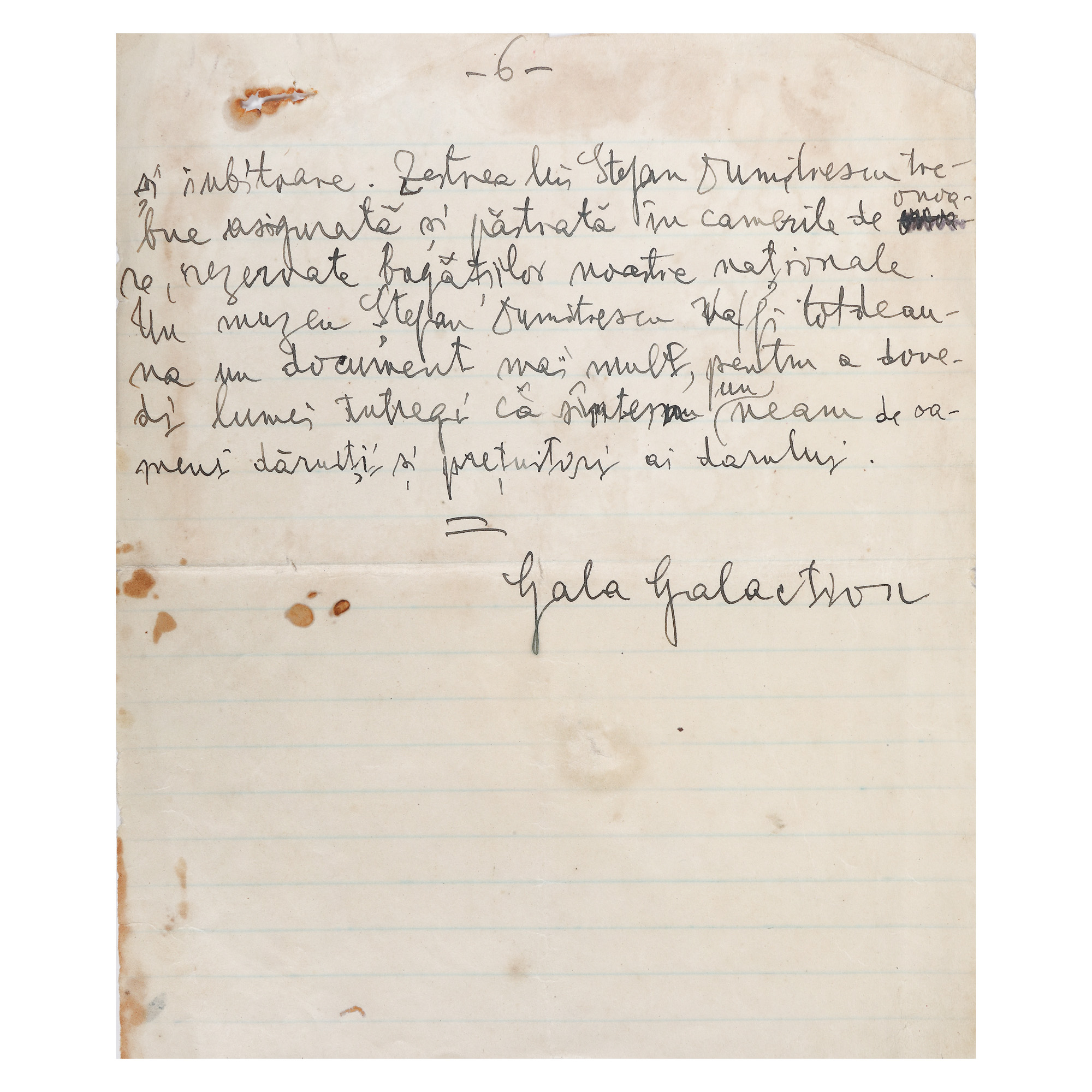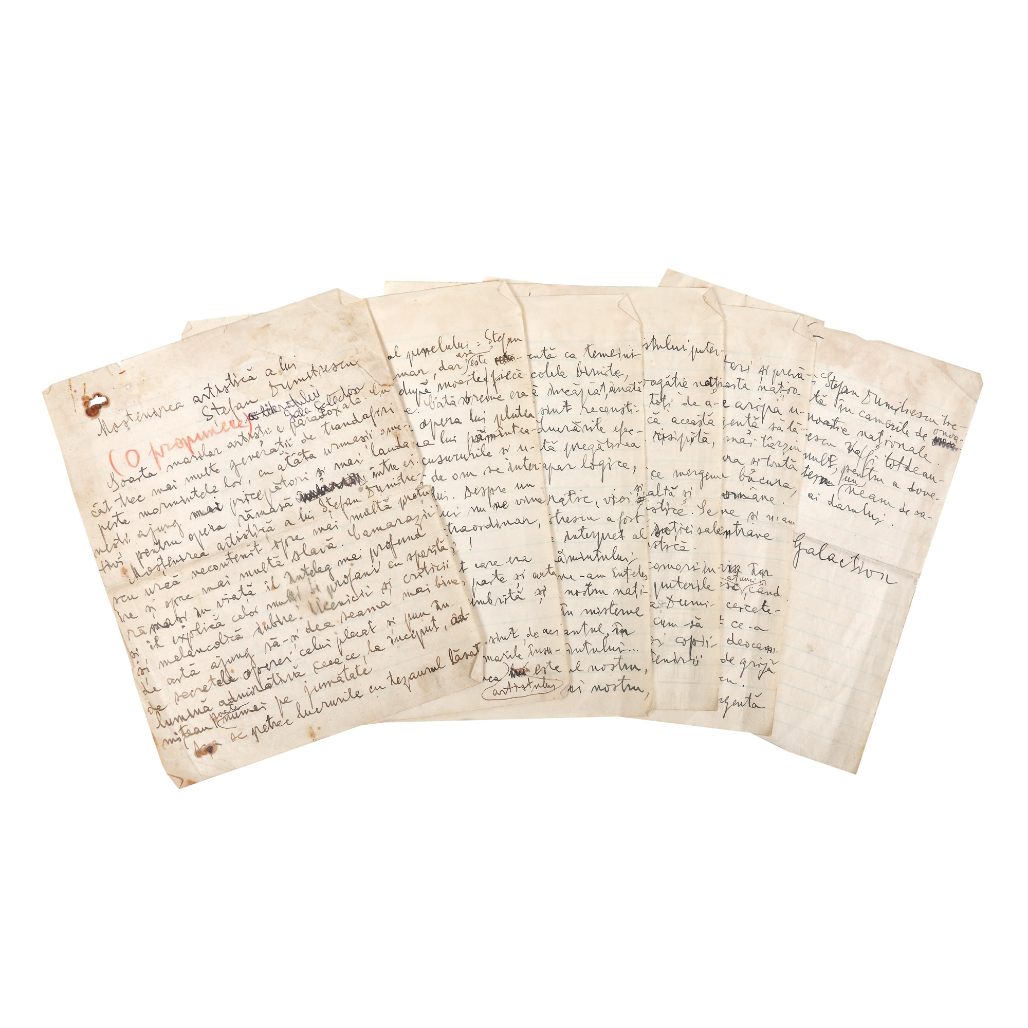 72. Manuscris „Moștenirea artistică a lui Ștefan Dimitrescu", de Gala Galaction, format din șase file, scrise și semnate olograf, cca. 1933
