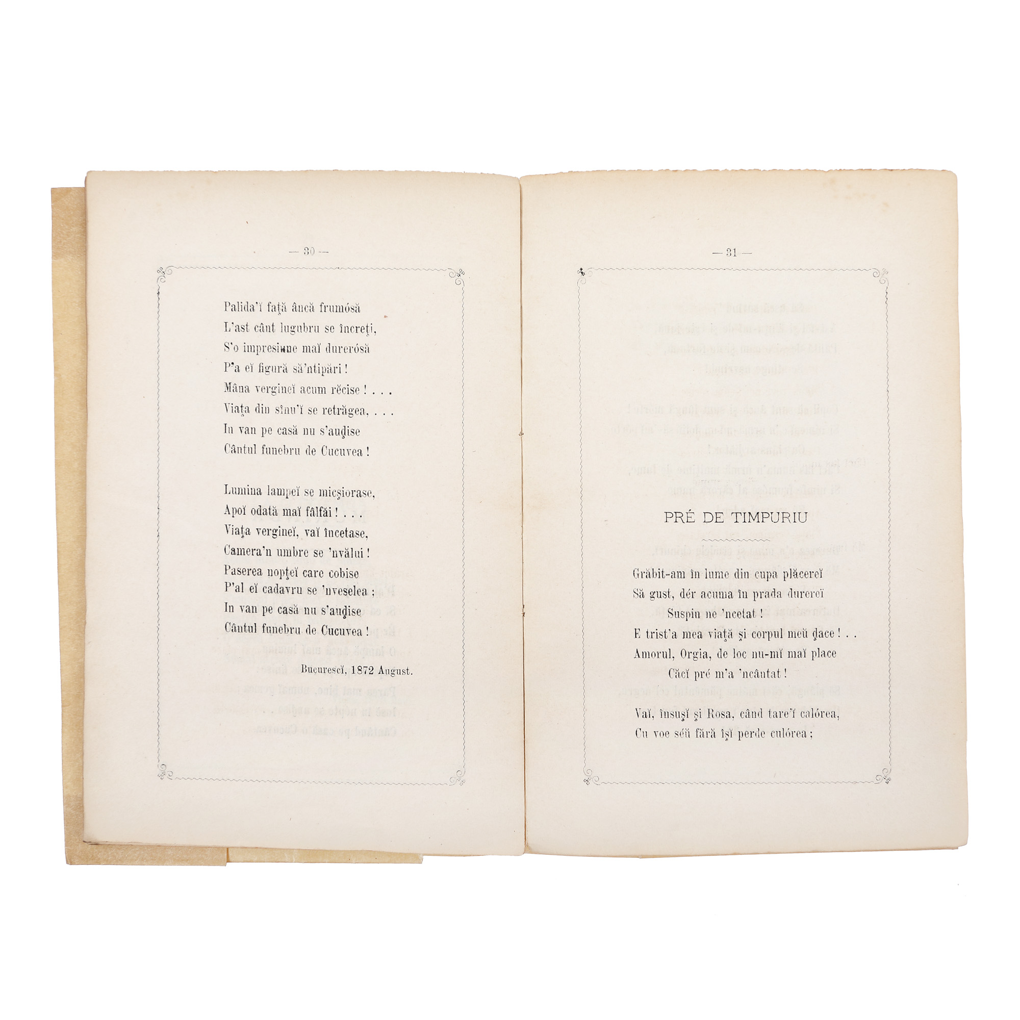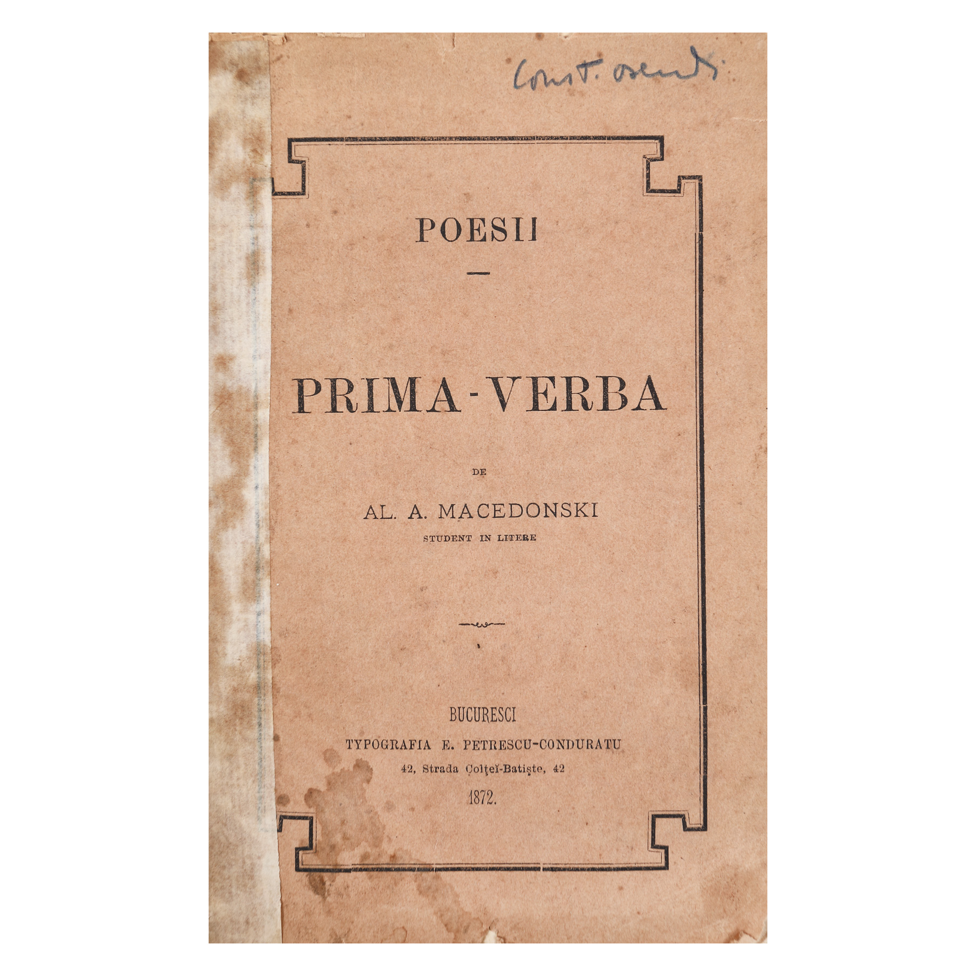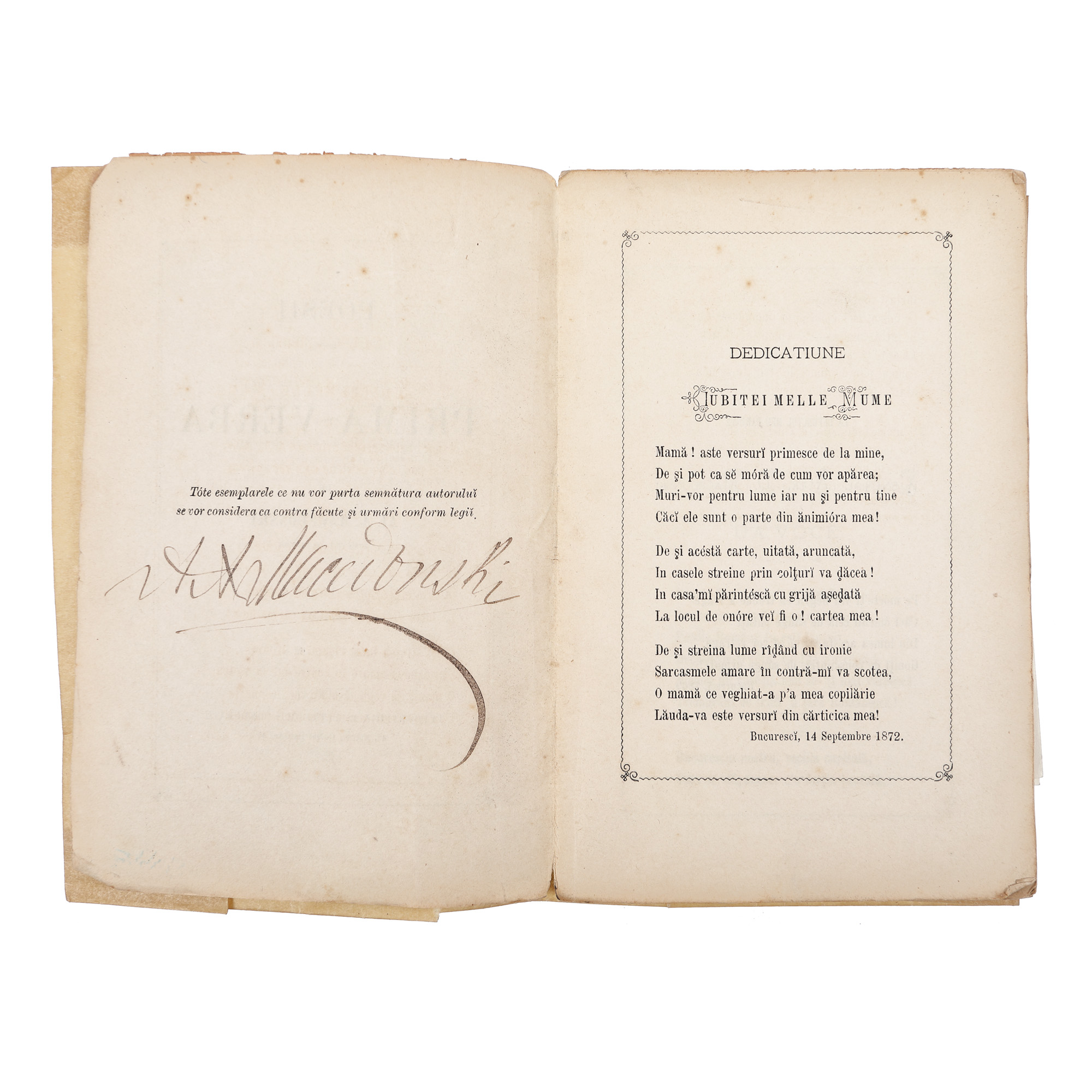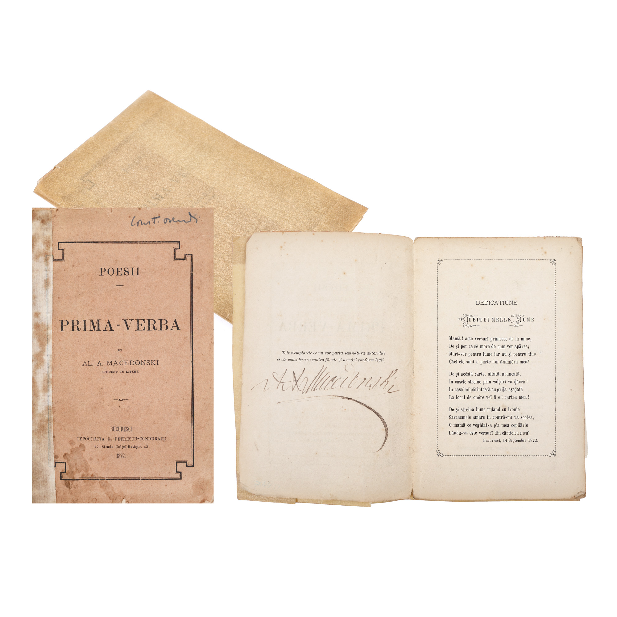 108. ”Prima-verba”, de Alexandru Macedonski, ediție princeps, București, 1872, cu semnătura autorului, provine din colecția criticului literar Șerban Cioculescu